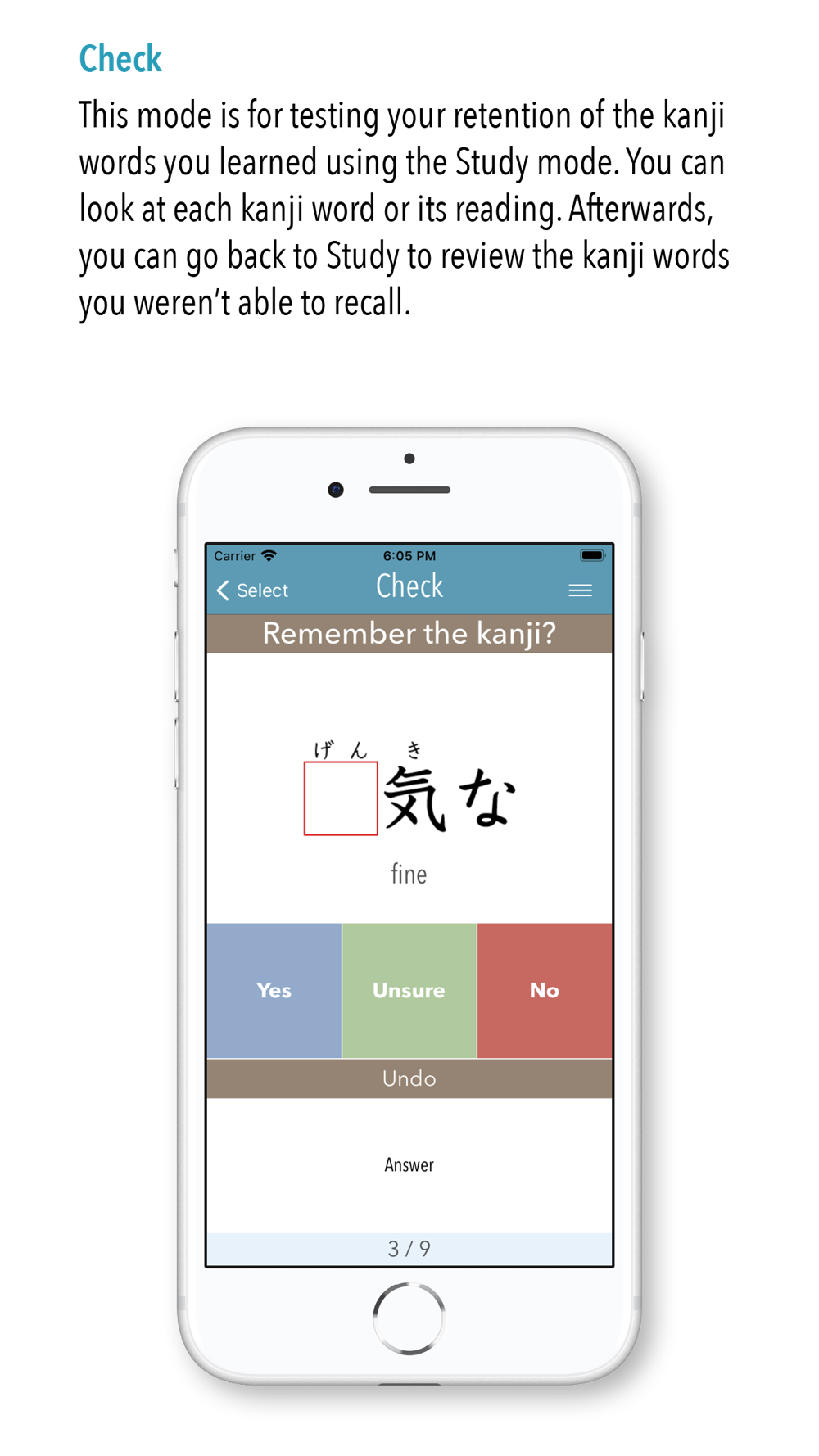 GENKI Kanji for 3rd Ed. is an app that helps users become able to recognize 317 basic kanji by studying more than 1,100 kanji words at their own pace!