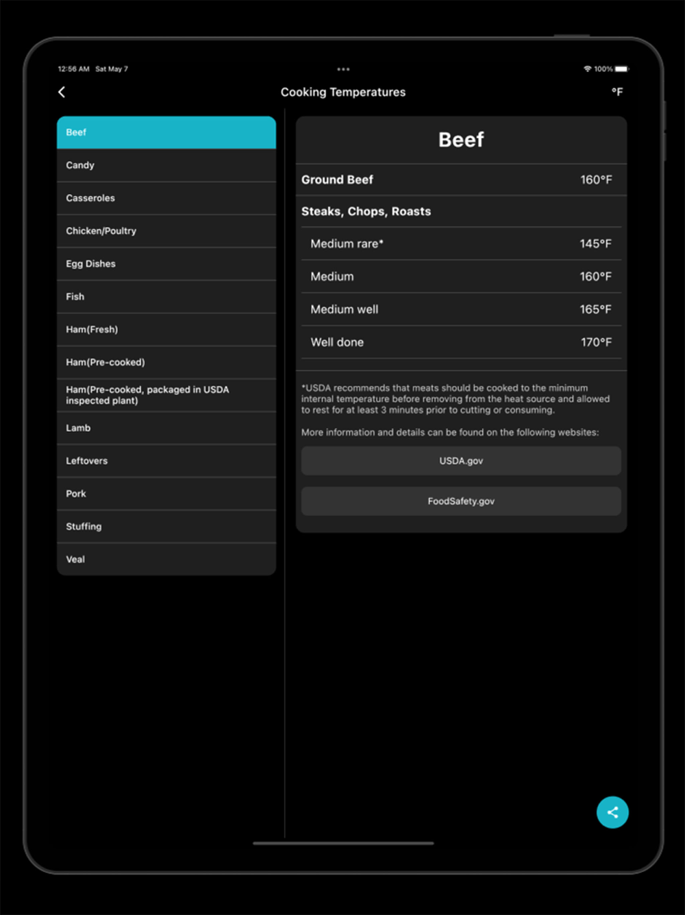 Easily look up the USDA recommended cooking temperatures of most dishes such as meats, eggs, and casseroles. You can also look up candy cooking temperatures that tell you the stages of sugar at each temperature range.