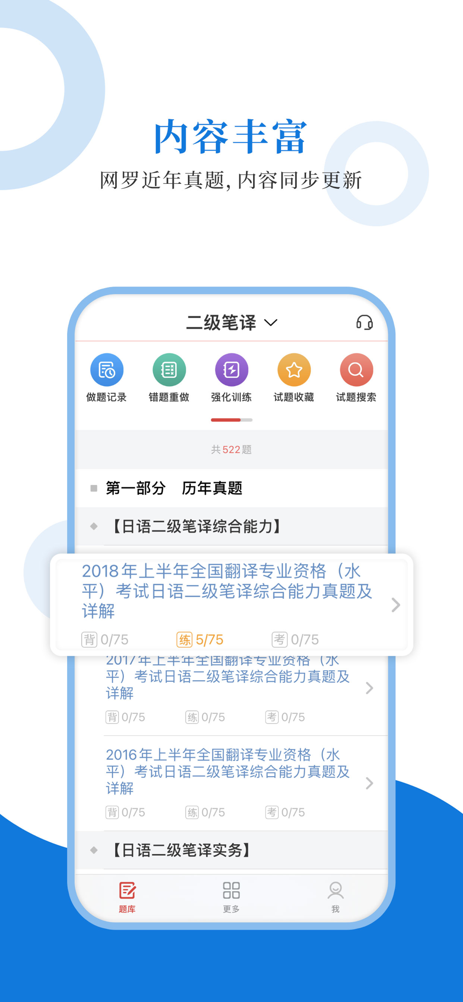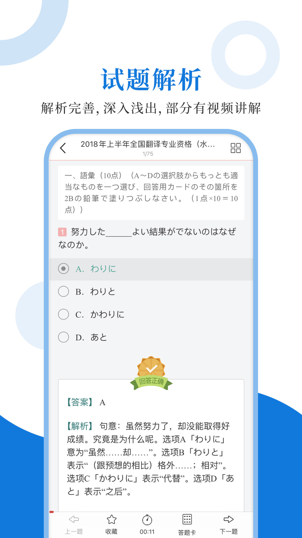 专为全国翻译专业资格水平考试日语考试精心准备的考试配套题库,每一道试题都有答案解析,为考试提供了充分的复习准备,可随时随地学习练习,支持手机、平板多端同时使用。