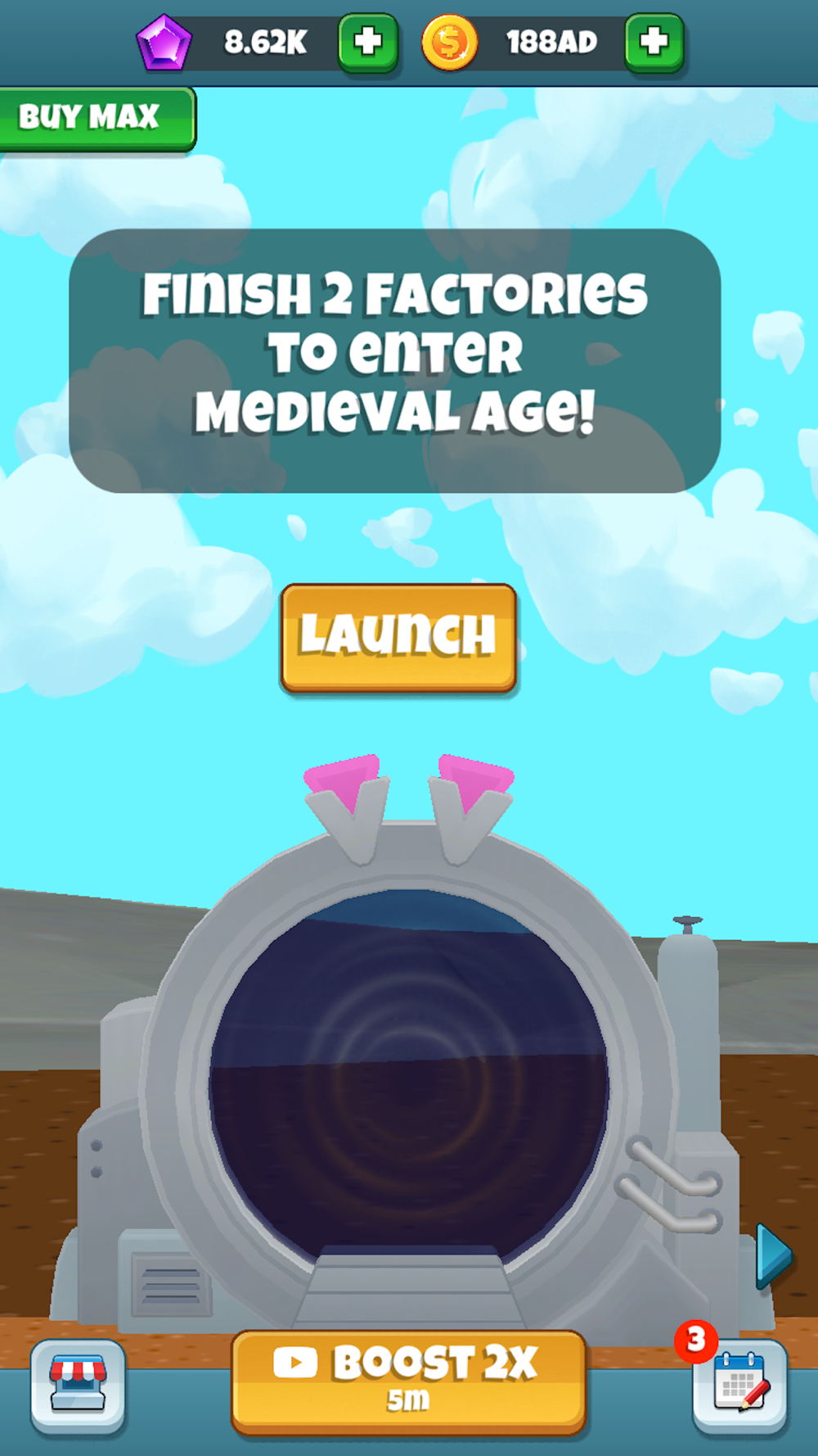 What better way to get ahead of the competition than by getting an early start, and what’s earlier than the stone age!? Hire cavemen to work in your factory and do the heavy lifting to grow your business. Upgrade your factory to move forward in time and hire more workers in each age to grind out more and grow your business. Keep your eyes on the prize and build a business that will last into the future and beyond!