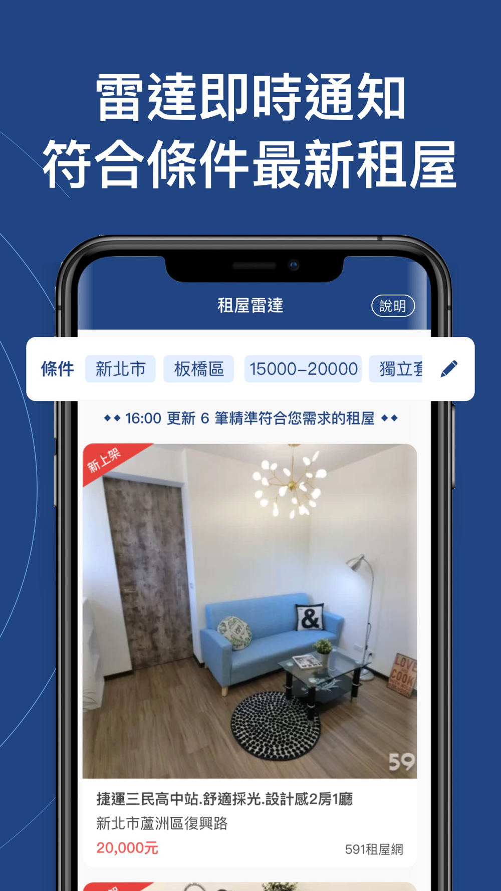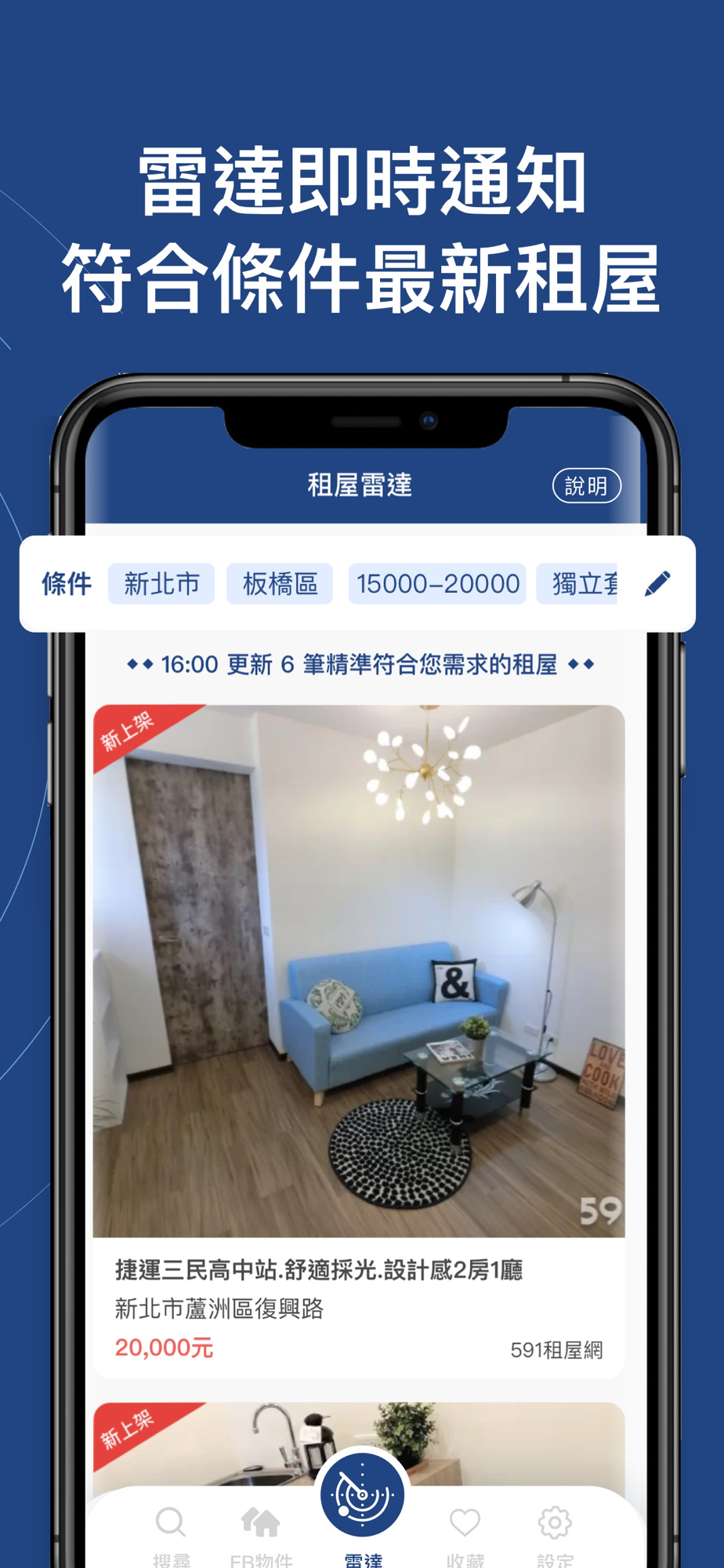 | 雷達功能: 雷達會在有符合您需求的物件上架時通知您,您不用再整日耗在591房屋、樂屋網、好房網、518租屋等租屋網,讓房子來找你~