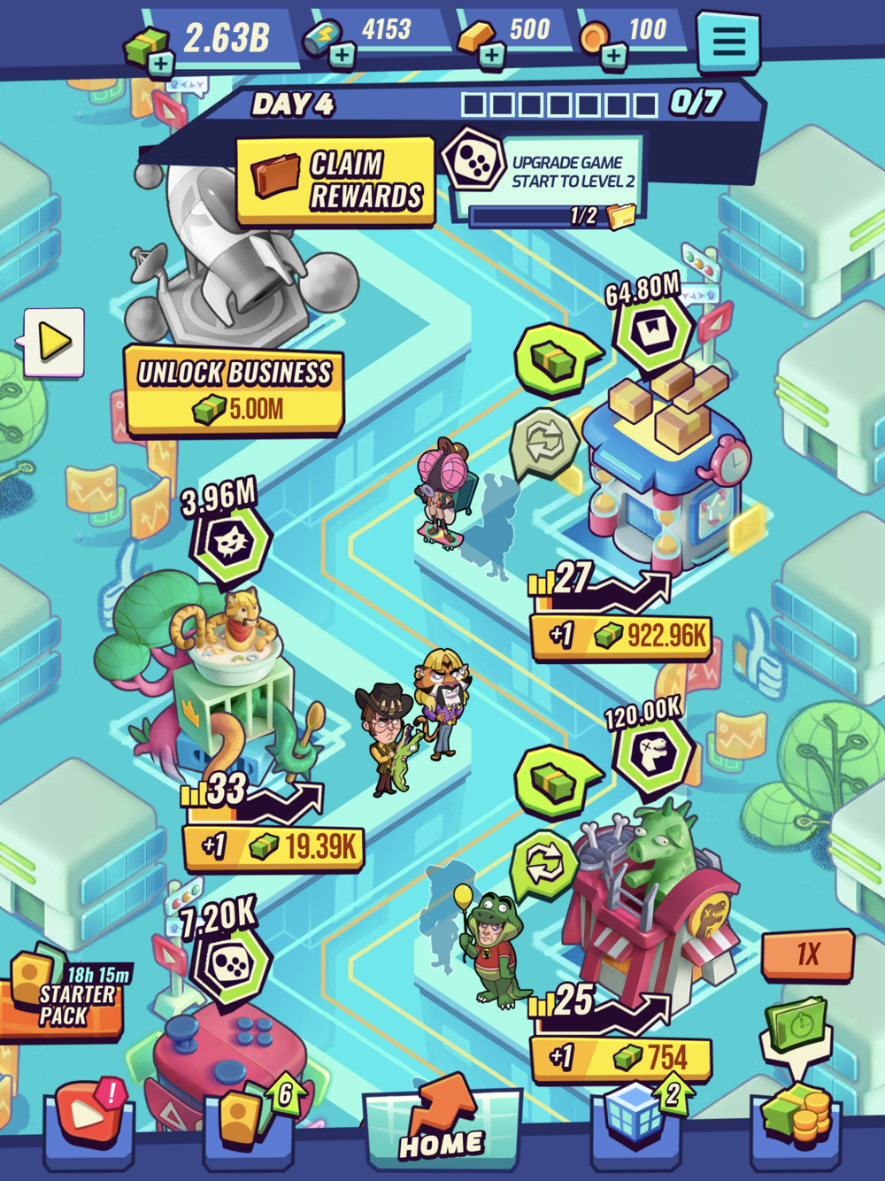 Lots of characters and businesses for you to profit from! Meet awesome accomplices and companies!