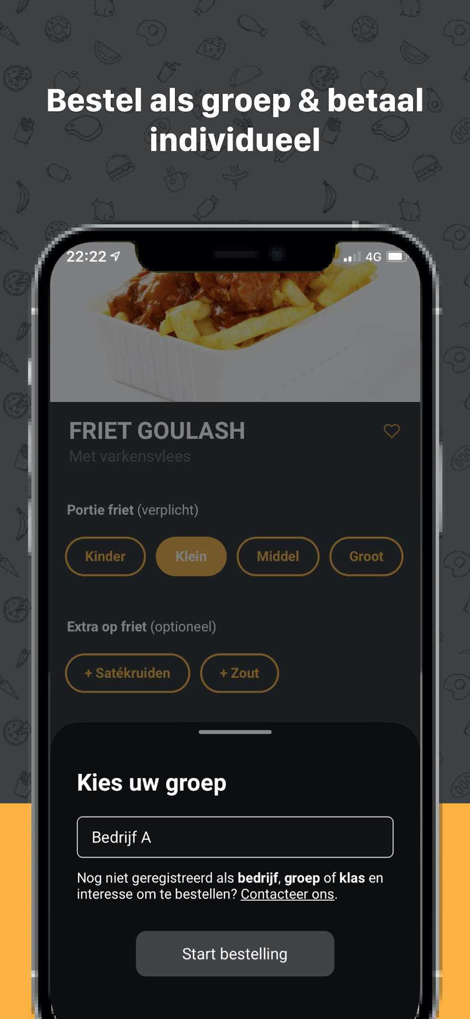 Laat je bedrijf of klas registreren als groep! Iedereen bestelt en betaalt individueel & wij zorgen ervoor dat alles samen klaar is op het afgesproken uur.