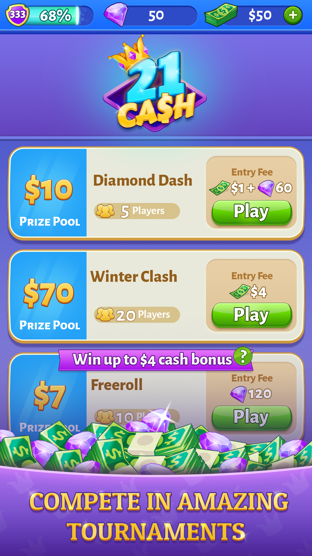 21 Cash™ is FREE to download and play. Note that Cash tournaments are not available in the following states: AZ, AR, IN, IA, LA, ME, MD, SC, MT & SD.