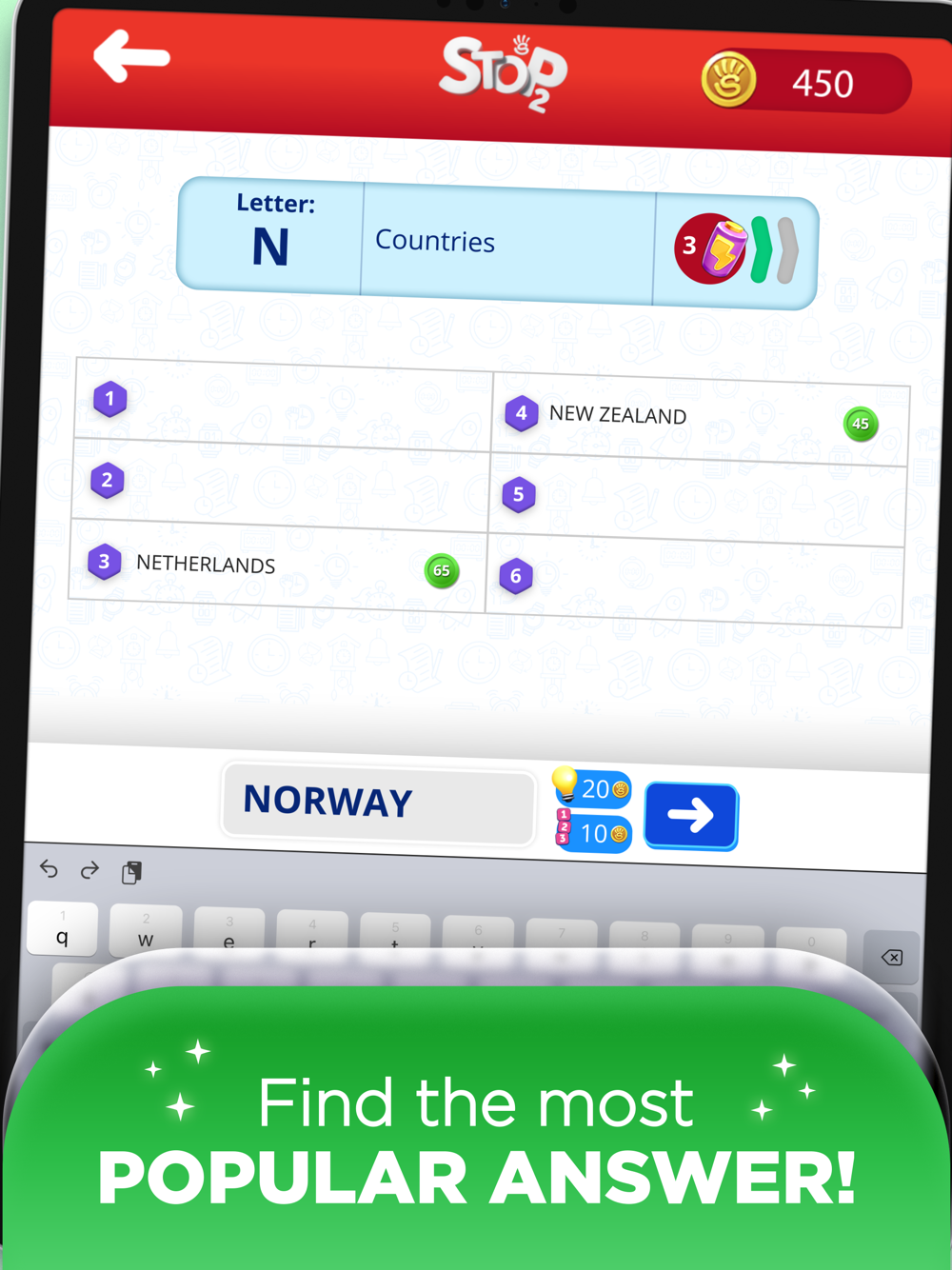 STOP 2 has updated the beloved quiz word game STOP for the modern concept of online games with friends. A new, customized experience where you can collect timers and select skins. There are themed, unique events, advanced multiplayer games and match-making, and new word game modes to play this challenging quiz.
