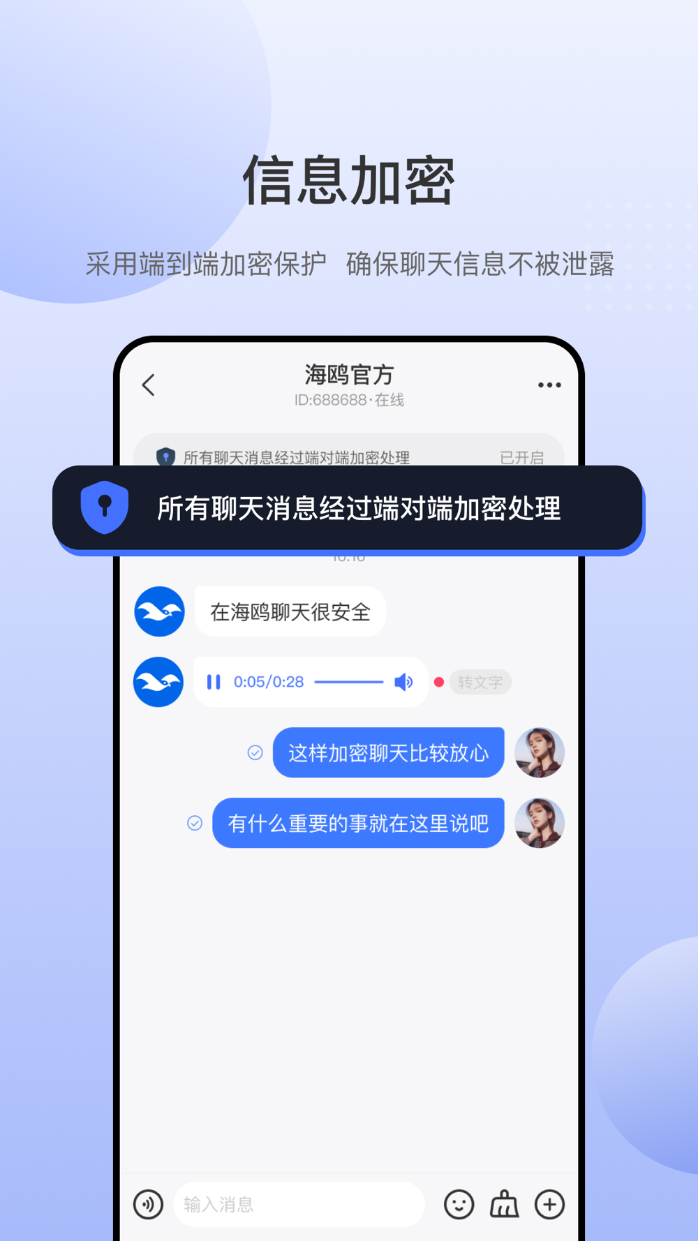 海鸥app是一款高效便捷,且安全可靠的加密即时通讯社交软件。