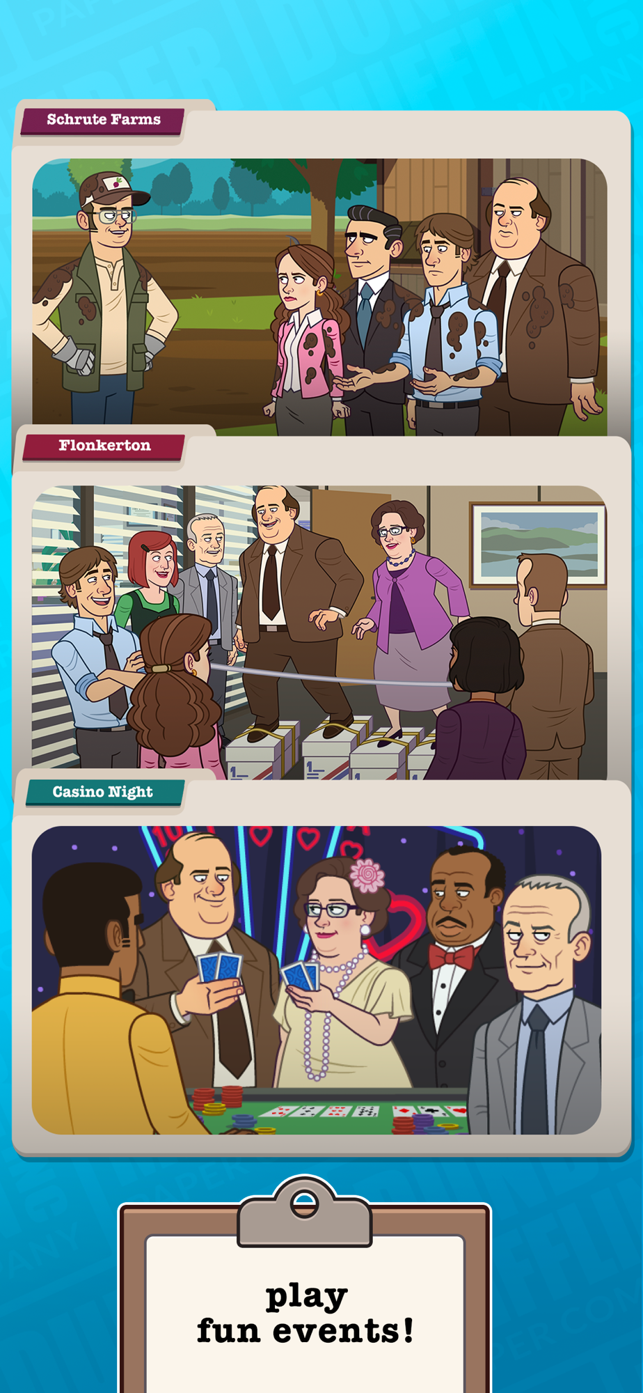 Tap, click, and upgrade to collect some of the most memorable characters from The Office including Prison Mike, Farmer Dwight, Pretzel Day Stanley, and of course Three Hole Punch Jim.