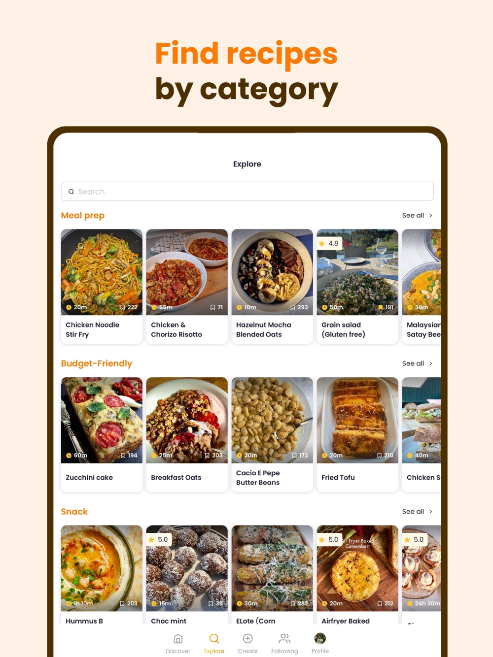 Lookup recipes by name or ingredient. Explore recipes by categories (quick, easy, healthy, budget friendly), by meal type (breakfast, dinner, dessert), by appliance (instant pot, air fryer), by cuisine (mediterranean, asian) and more! Thousands of recipes to try, no matter your skill level.
