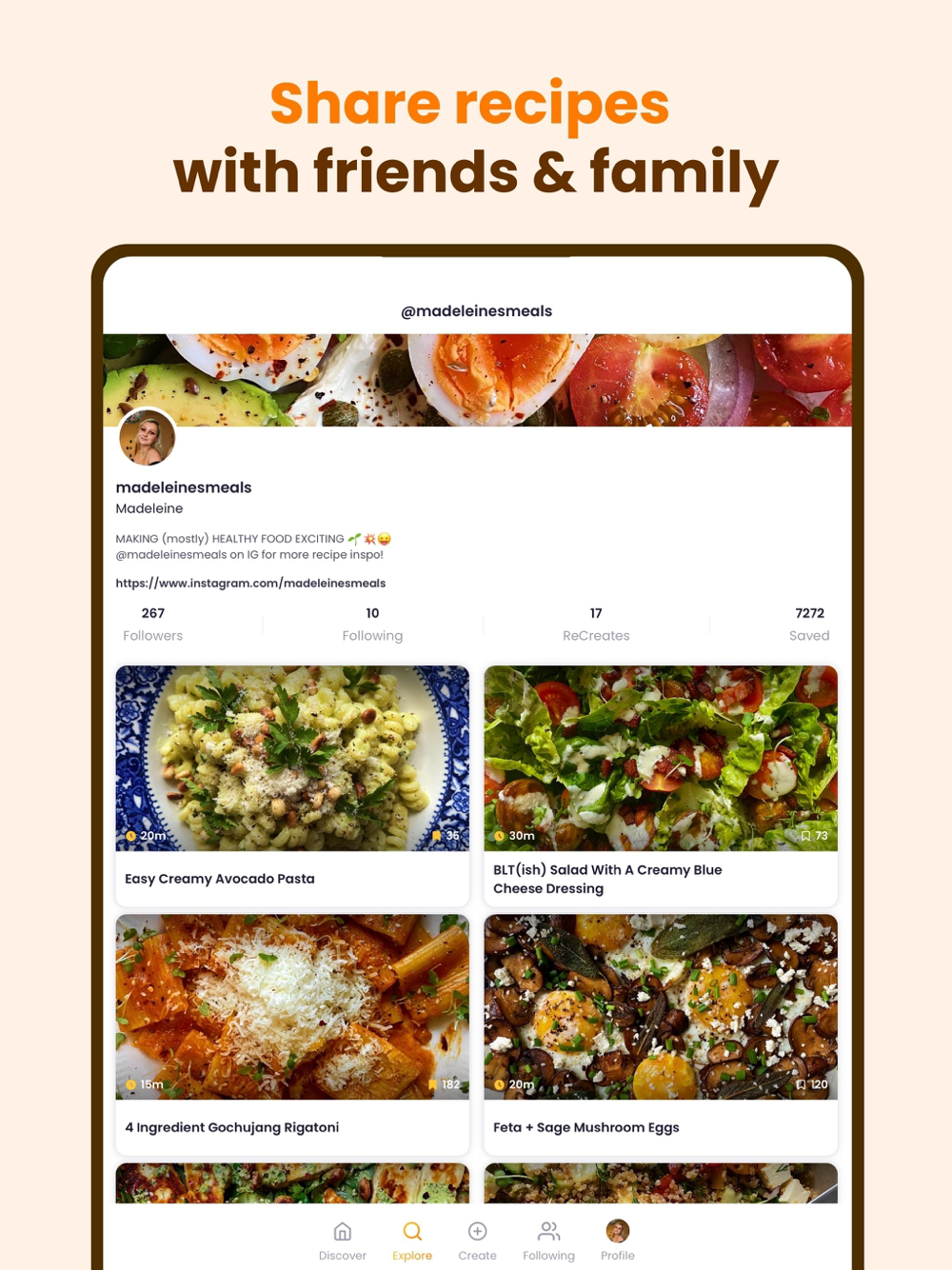 Time to get social! Once you upload your recipes, your friends will be able to see them if they follow you on ReciMe. Or, send the recipe directly through SMS, Whatsapp, Messenger or any other way you like to communicated.