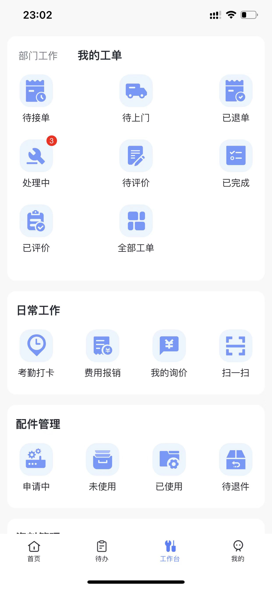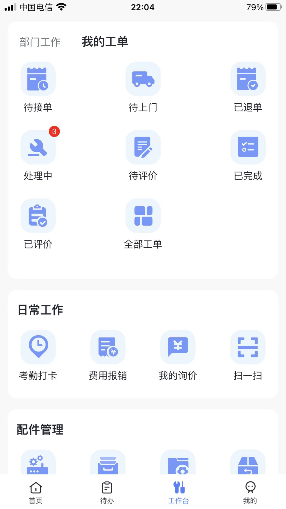 3、配件管理:实时追踪配件申请、发货情况,实时掌握配件库存