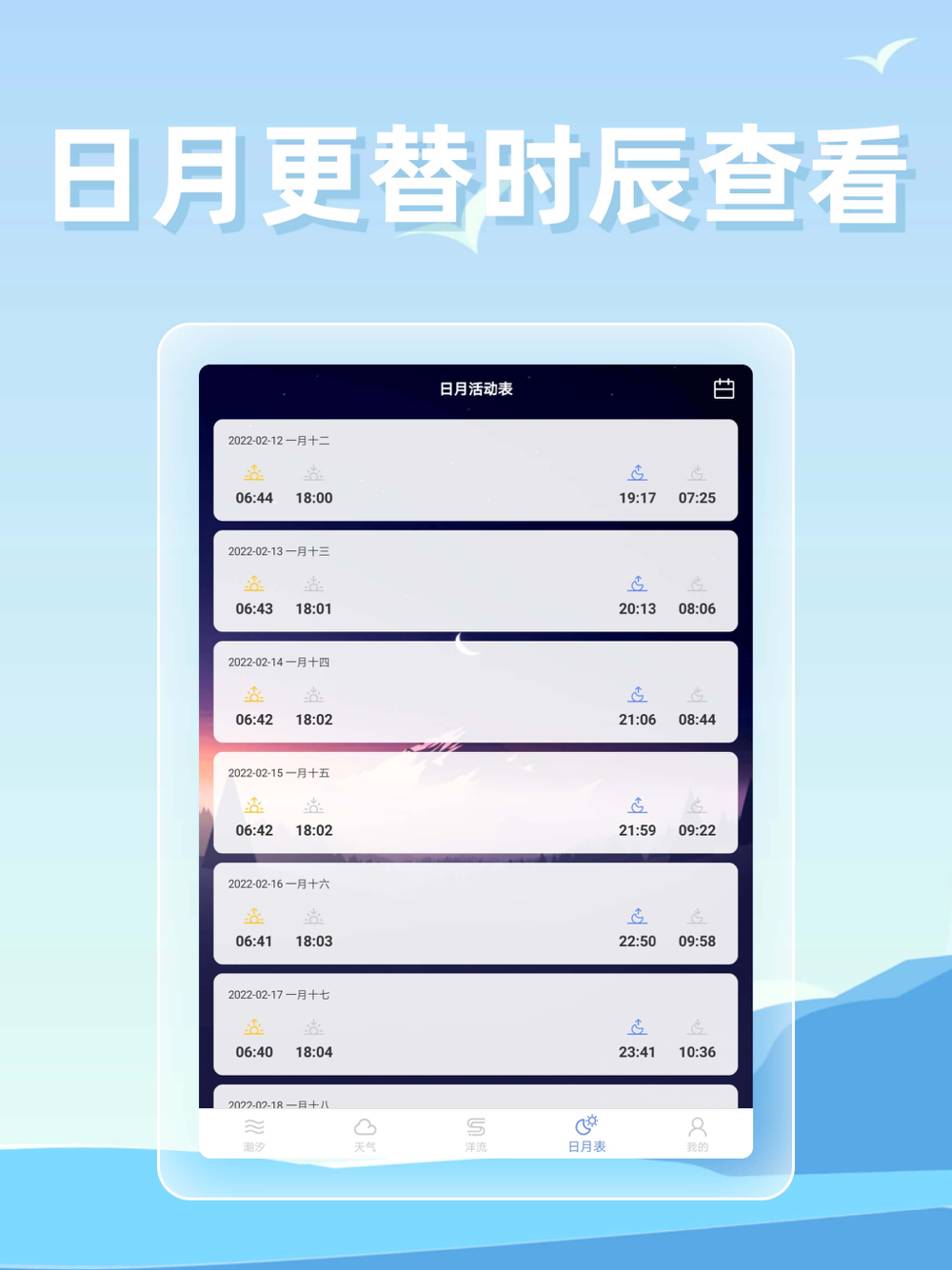 潮汐表:内置国内主要港口、岛屿及验潮站数据。查看涨潮退潮时间。