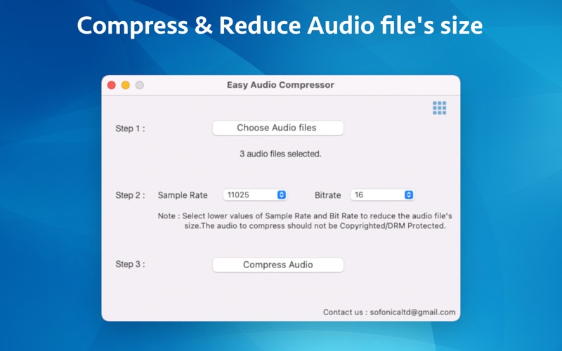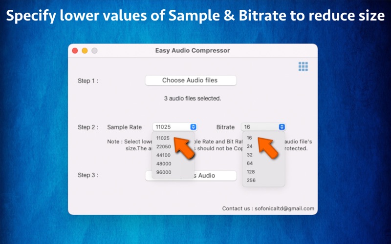 Easily compress and reduce multiple audio files in 3 easy steps. For example : By using the application, an audio file having size of 10 MB could be compressed to 5 MB size. In order to reduce the audio file's size, just specify a lower value of Sample Rate and Bit Rate. When lower Sample Rate and Bit Rates are applied to the audio, the audio file's size gets reduced and the application generates audio files with much lower file size. This also helps to save the disk space. The generated audio files are of good quality and are much lower in size than the original file sizes of the audio files.