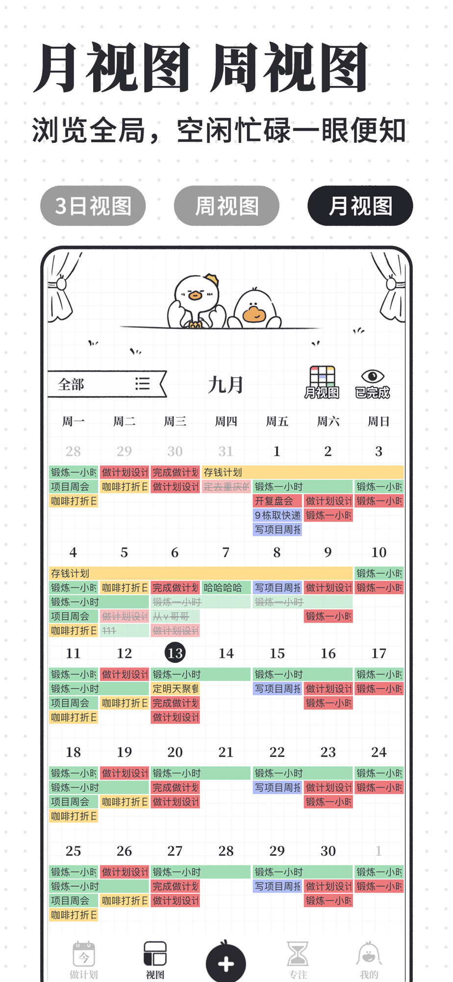 《我要做计划》是一款记录待办事项、高效做计划、管理日程的效率类应用。简约风格&操作简单,还有可爱的小胖鸭陪你在点滴中进步,无纸计划让优秀变得简单!