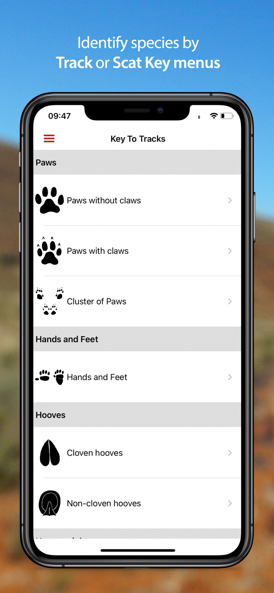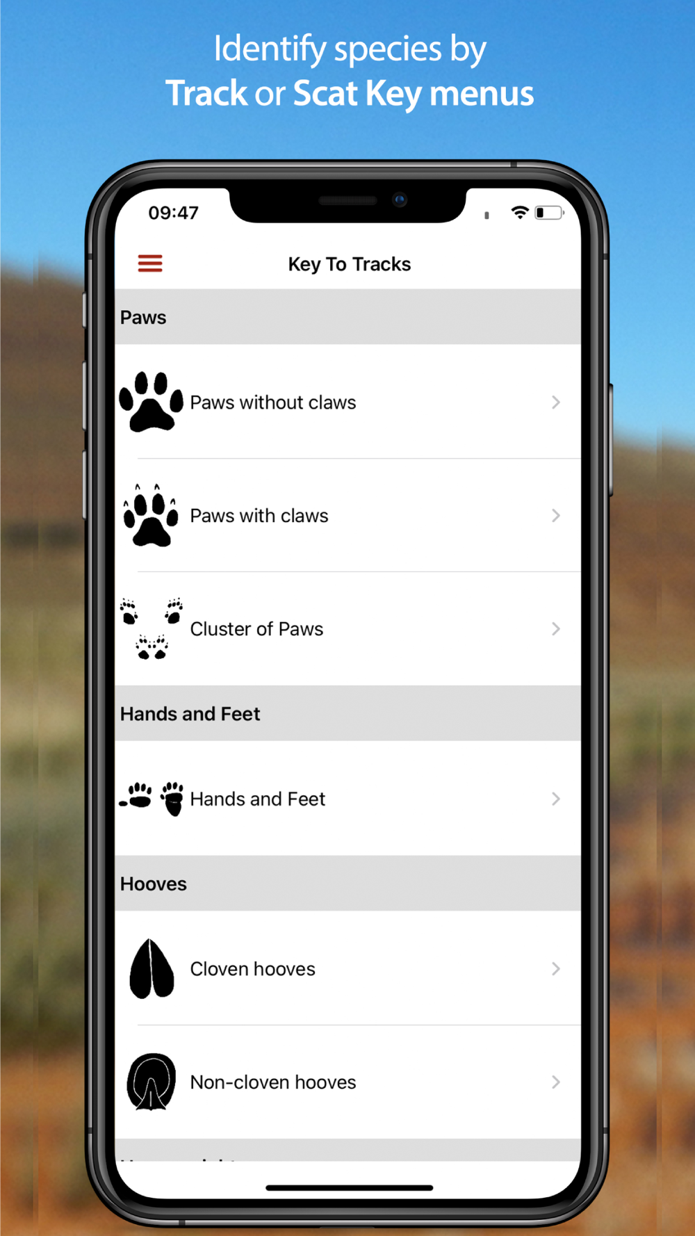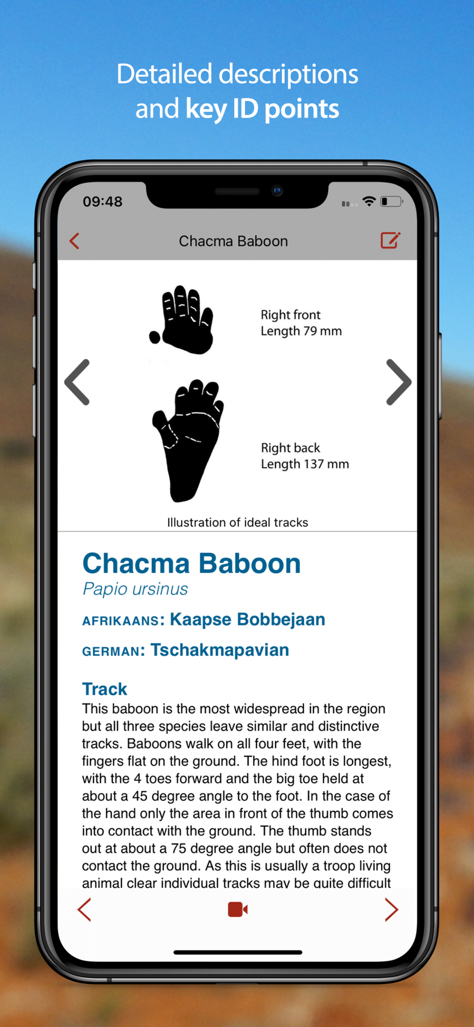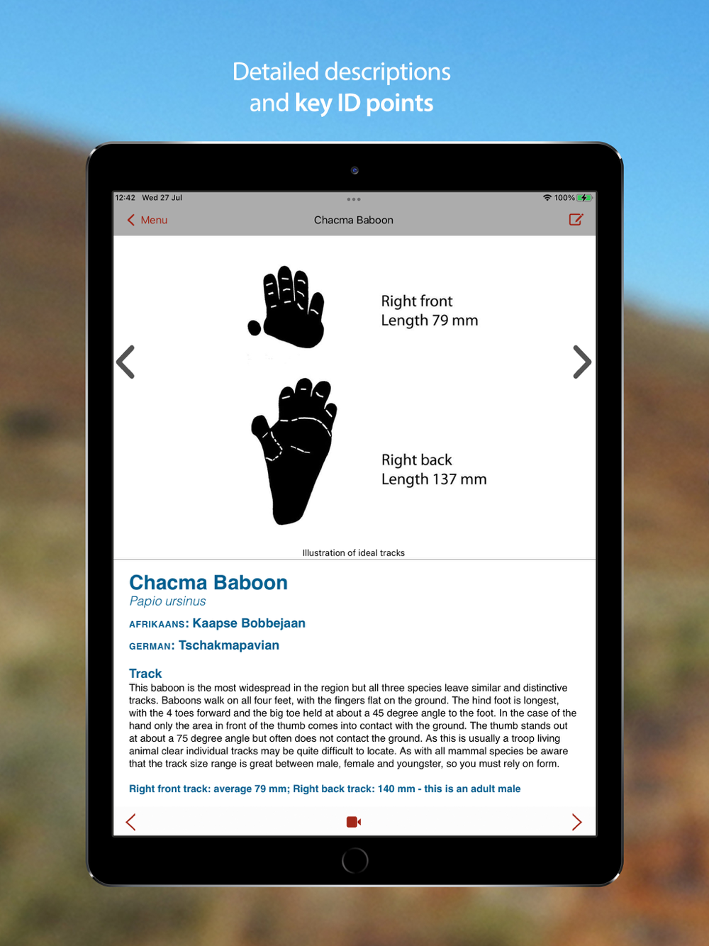 The app includes highly accurate track and scat drawings, detailed species descriptions, multiple photographs and videos to give a comprehensive visual account of each animal’s tracks and signs. Additional smart search filters, including search-by-region functionality, and shortcut keys to tracks and scats allow for more accurate identification of spoor to family and species level.