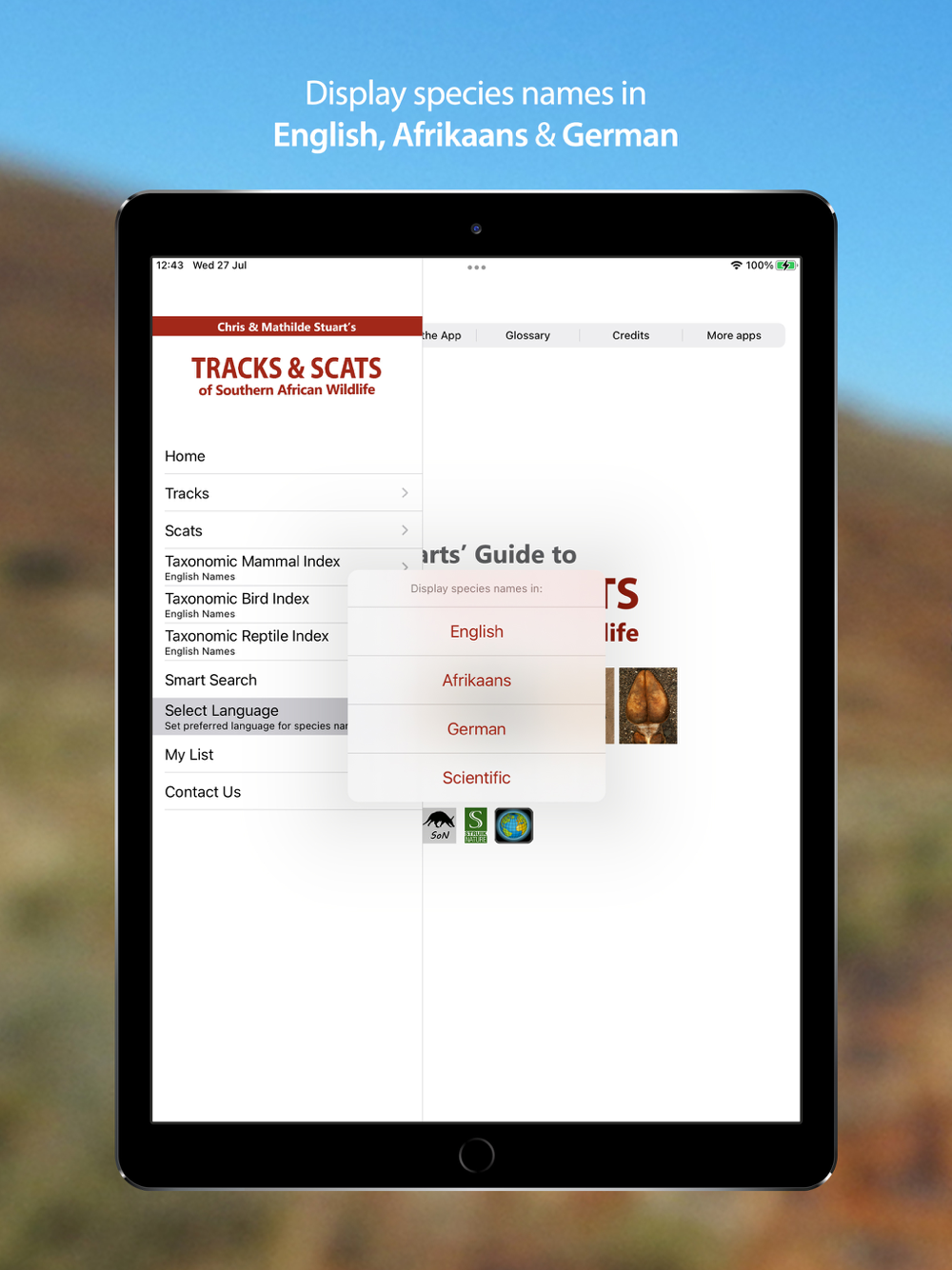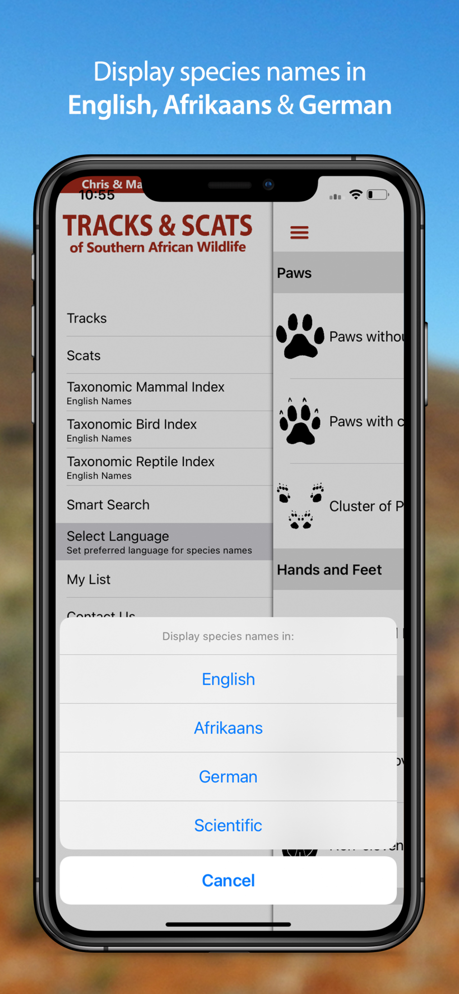 • Search species by English, Afrikaans, German & scientific names