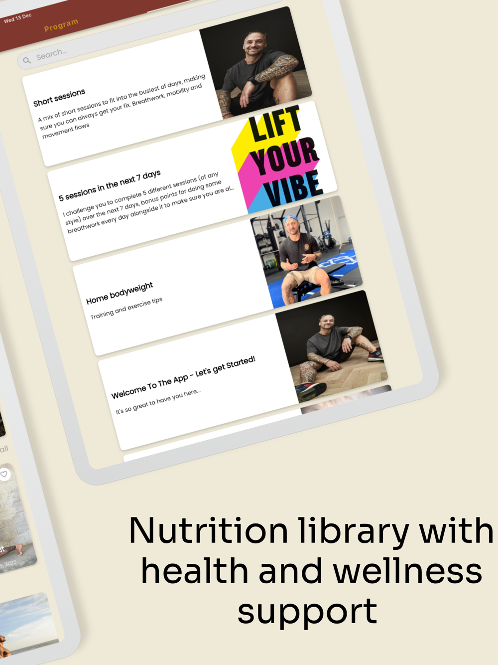 The app is designed to help all levels of fitness and ability. You can choose how many days per week you would like to practice and choose from the abundance of new delicious recipes. You will be provided with a mix of strength workouts, yoga, mobility, stretching, breathwork, and direct coaching with Richie.