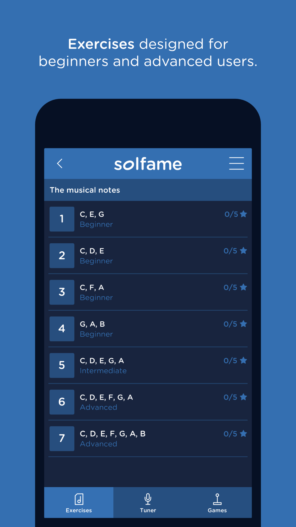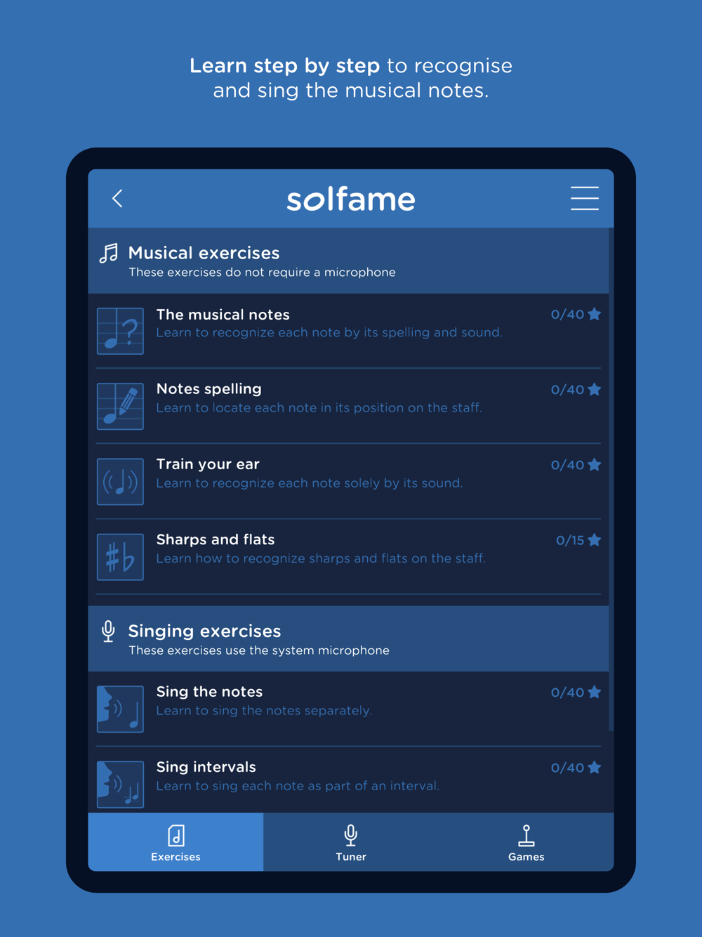 The exercises section is divided into different levels of difficulty (beginner, intermediate and advanced), with which you can start from scratch and progress in your learning. It contains a number of distinct types of exercises. Some in which you practice by singing using the microphone and other exercises in which the voice is not needed because the user interacts by touching the screen to learn the notation -spelling- and sound of the notes. In addition, it includes a scoring system with which to measure your progress.