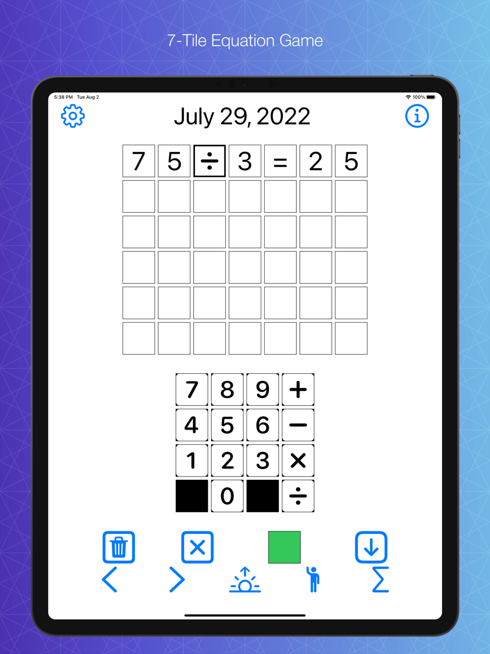 The Equation Game generates an equation to guess with both addition and subtraction or multiplication and division or all four operators from 6, 7, or 8 tile equations.