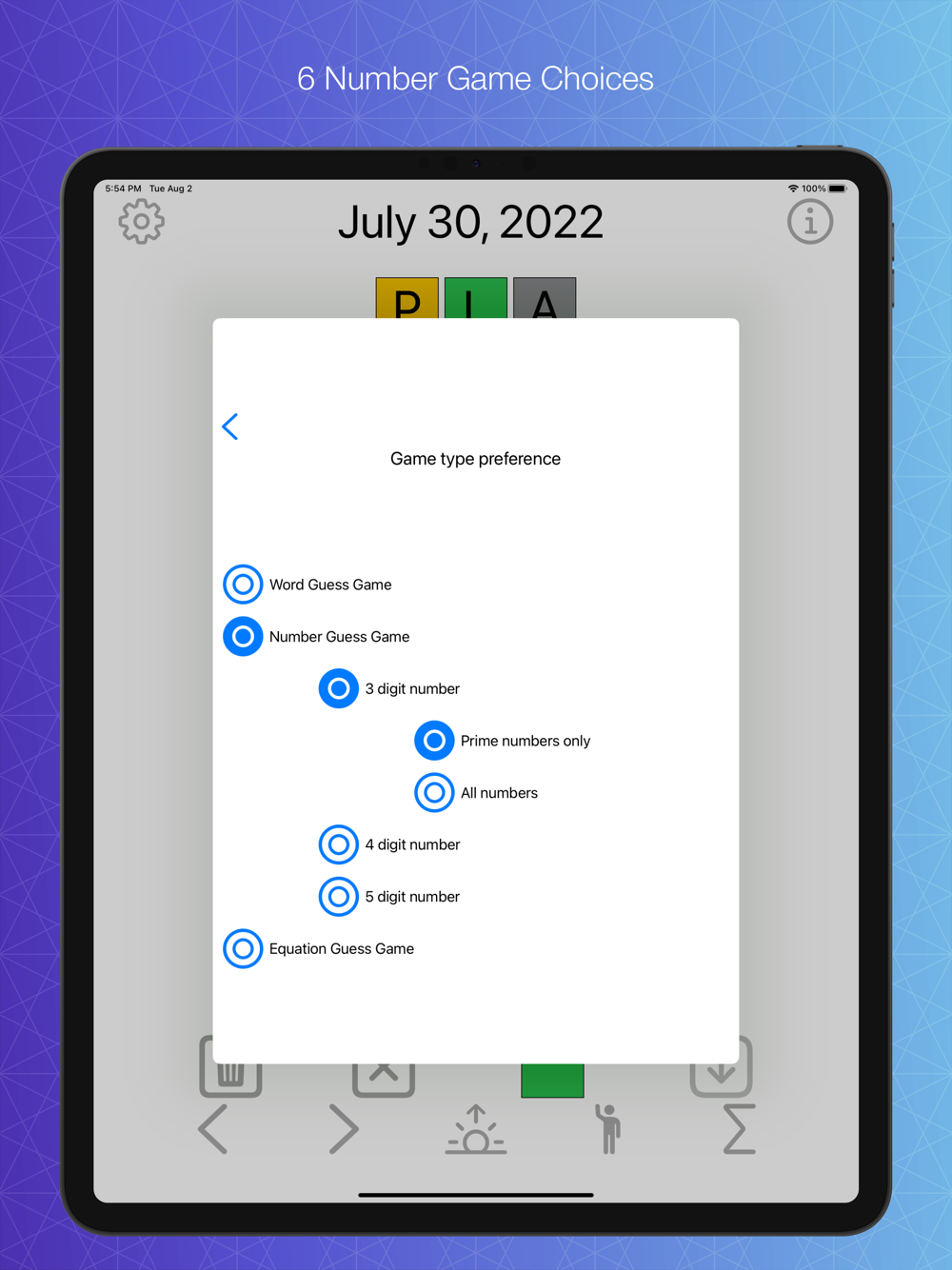When app is first loaded you will have access to the Word/Number/Equation games for the previous two weeks.