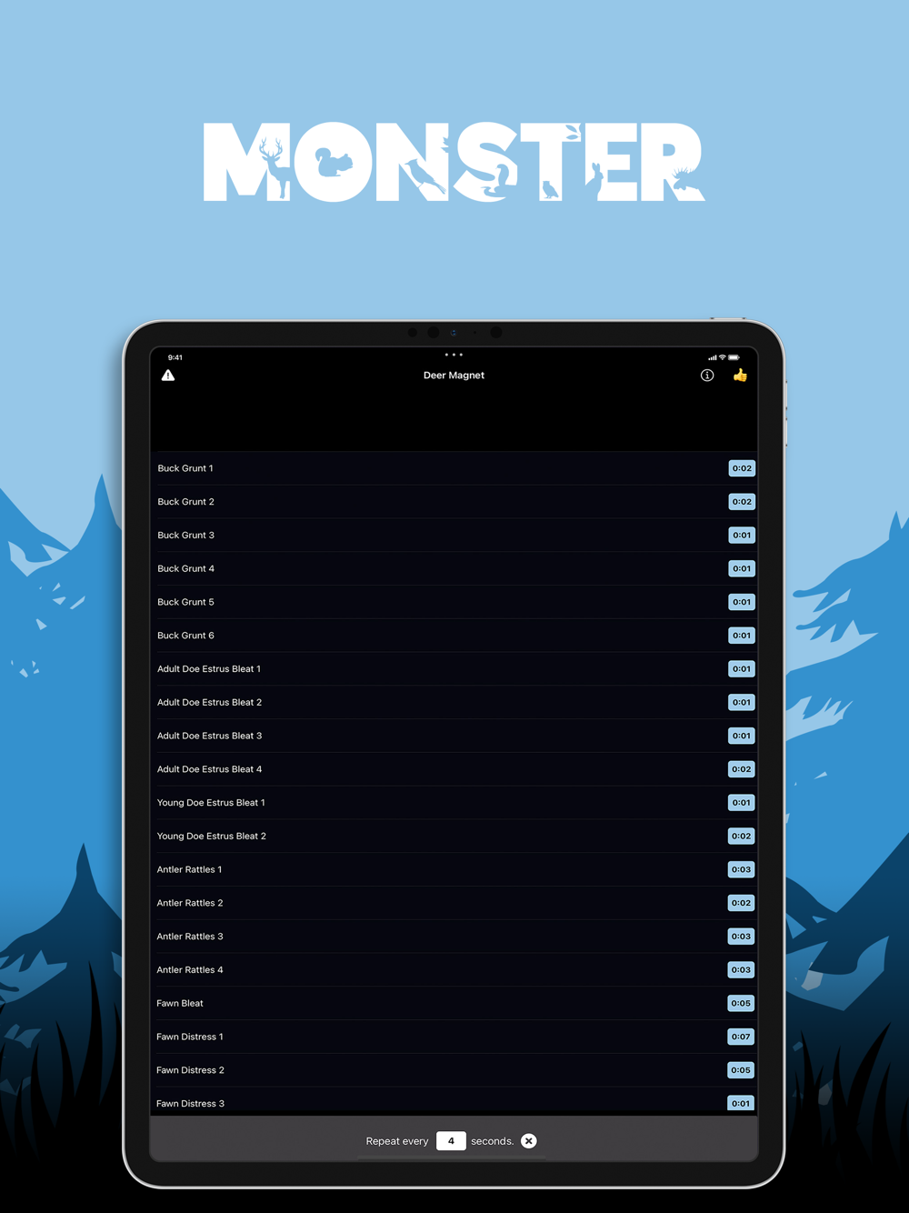 You can play the sounds individually and set them to repeat after the amount of seconds that you desire. Or you can manually tap different sounds create a deadly combination of calls that will work perfectly for the deer you are hunting.