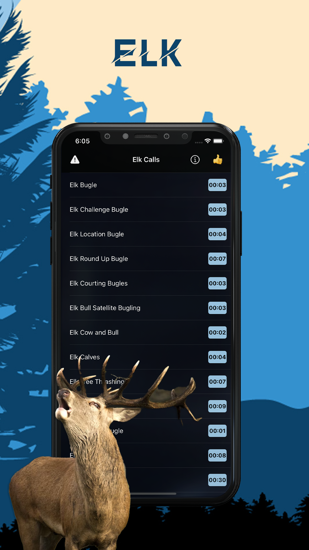 No longer do you need drag along bulky elk hunting calls or the even more cumbersome elk bugle. With this elk sounds and elk calls app you can simply select from a large selection of different elk sounds and elk bugles to attract the elk to your hunting location.