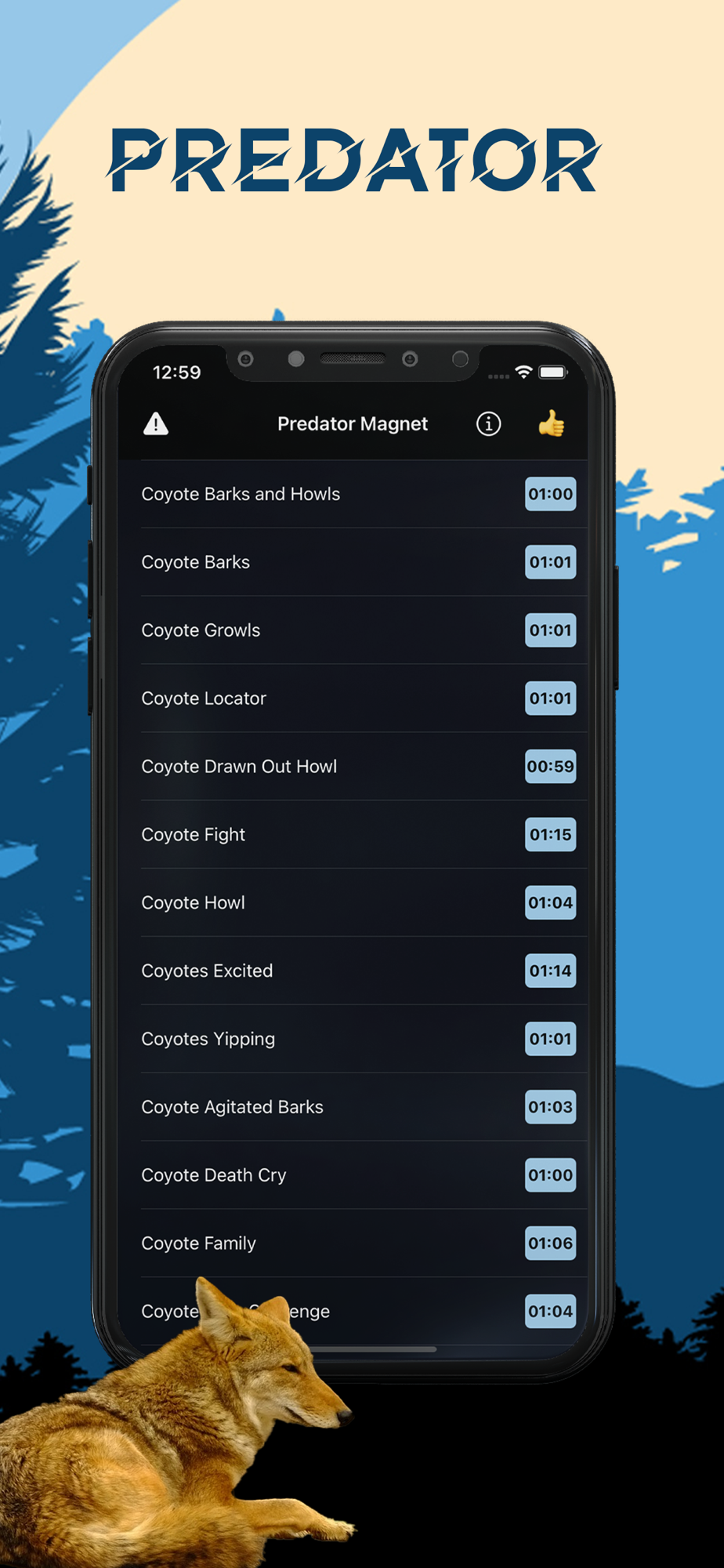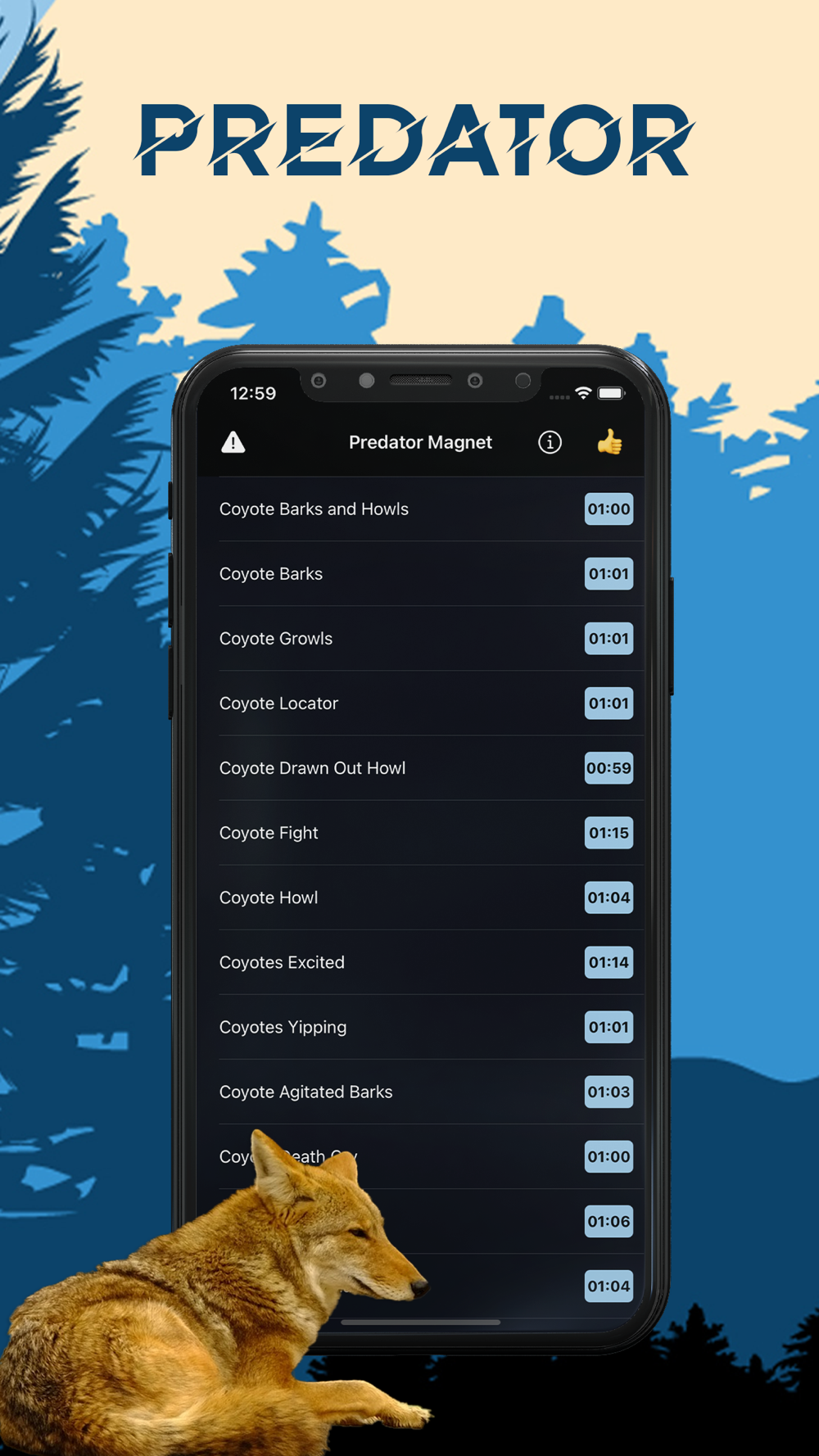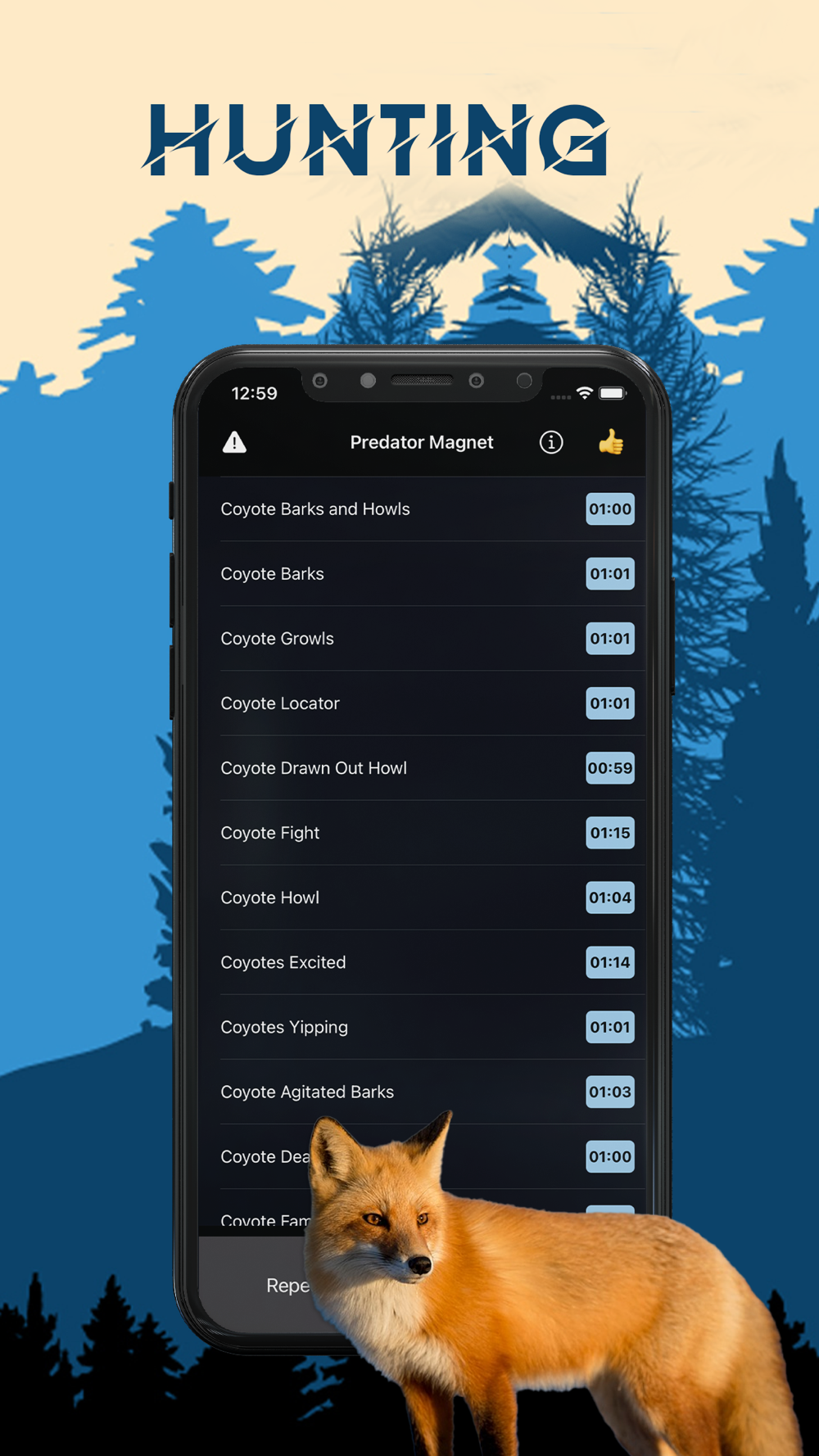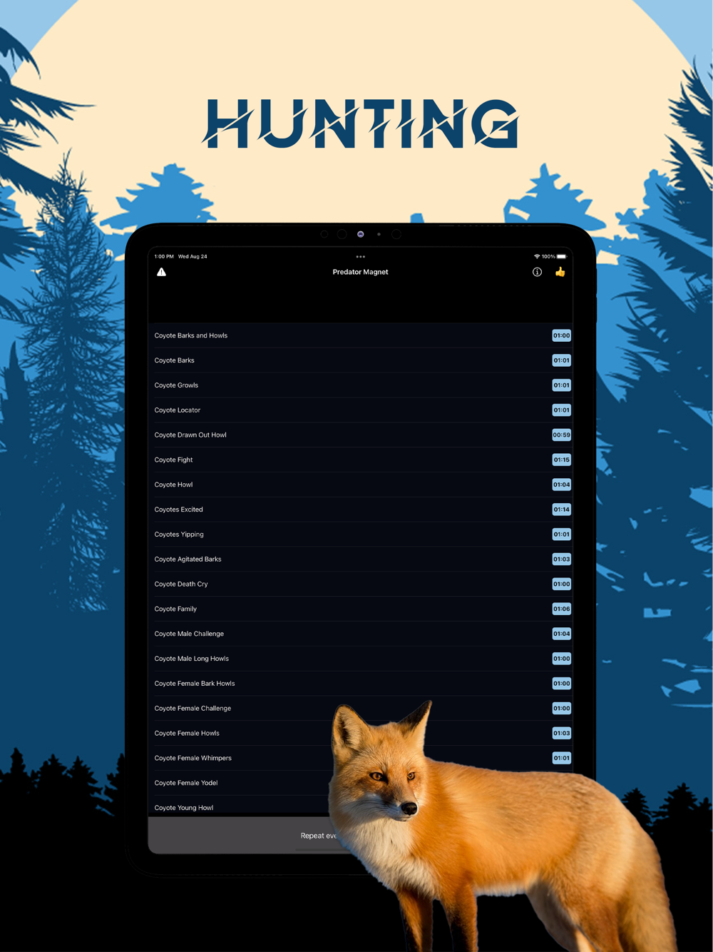 No longer do you need drag along bulky electronic callers to your favorite hunting spot to be a predator pro predator calls for fox hunting & predator hunting. With this predator hunting calls app you can simply select from 70 different predator sounds to attract coyotes and fox and other predators into your shooting lanes.