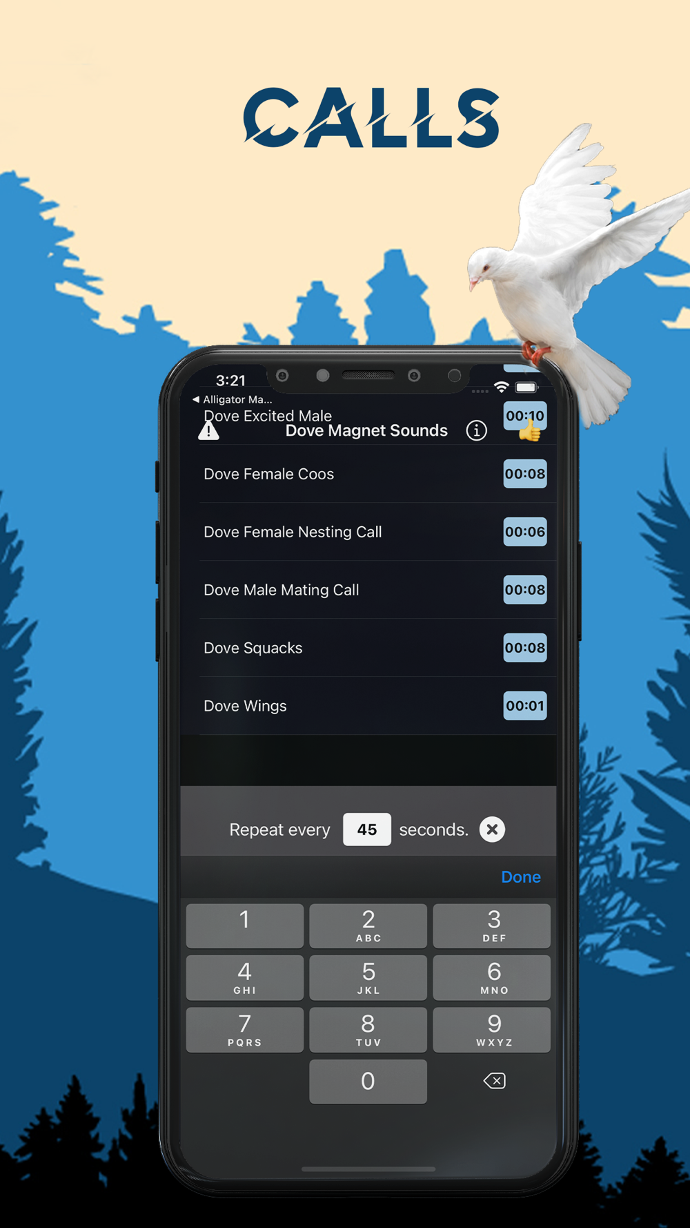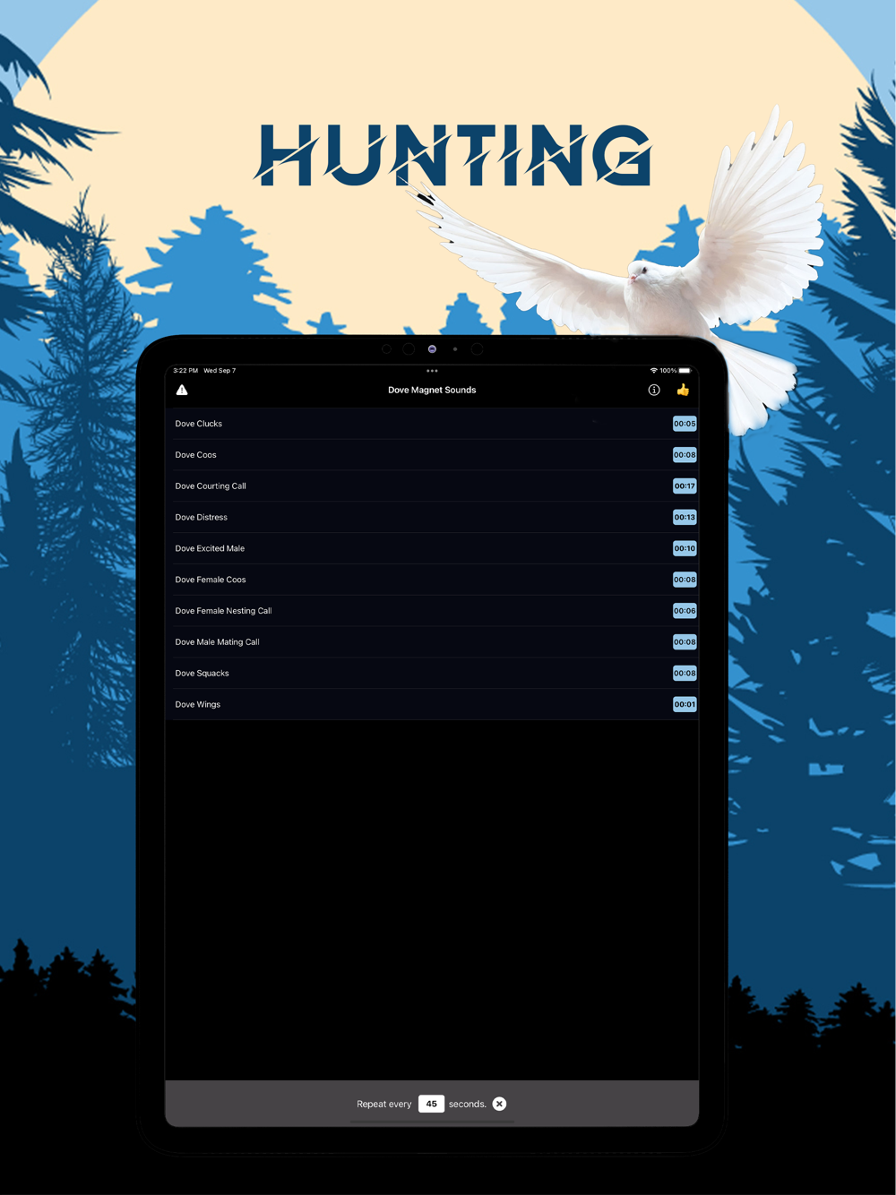 No longer do you need drag along bulky electronic callers to your favorite hunting spot to have dove hunting success. With this dove hunting calls app you can simply select from several different dove sounds to attract doves into your shooting lanes.