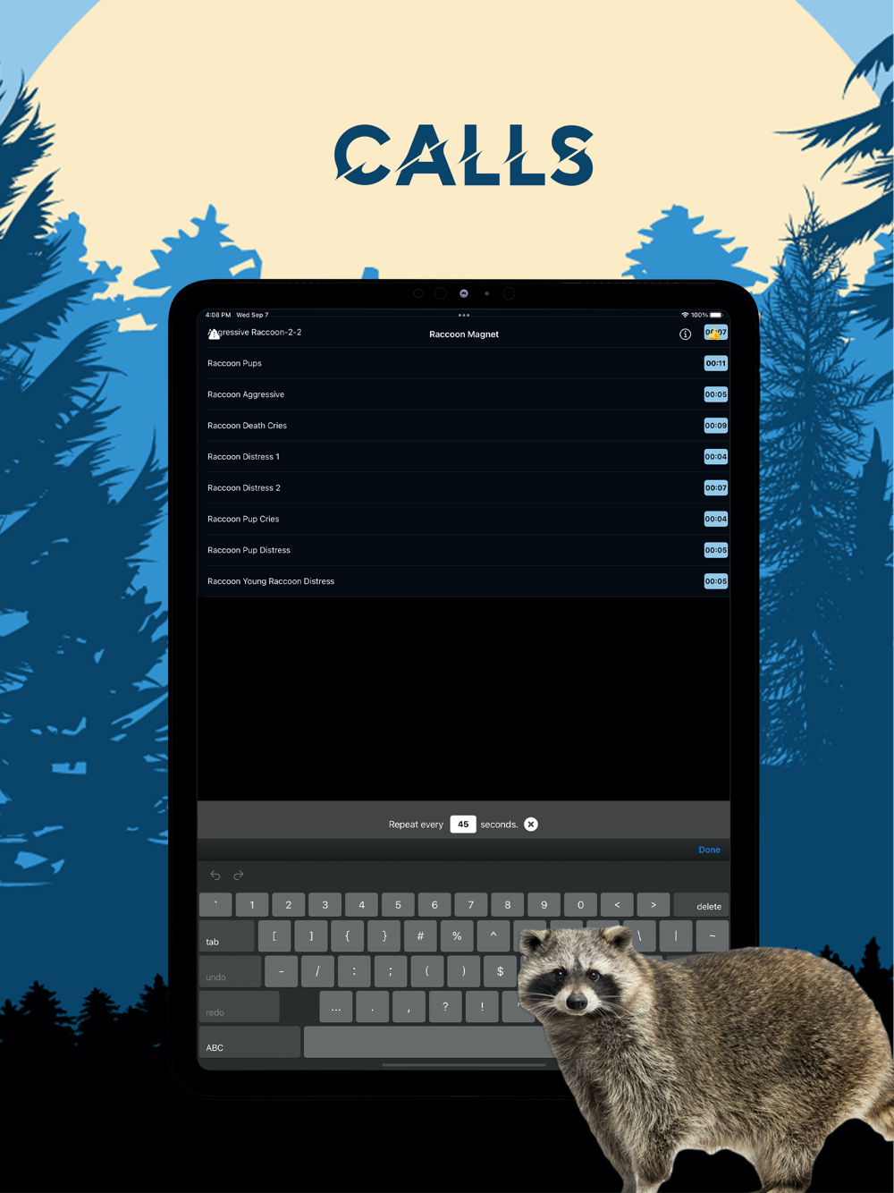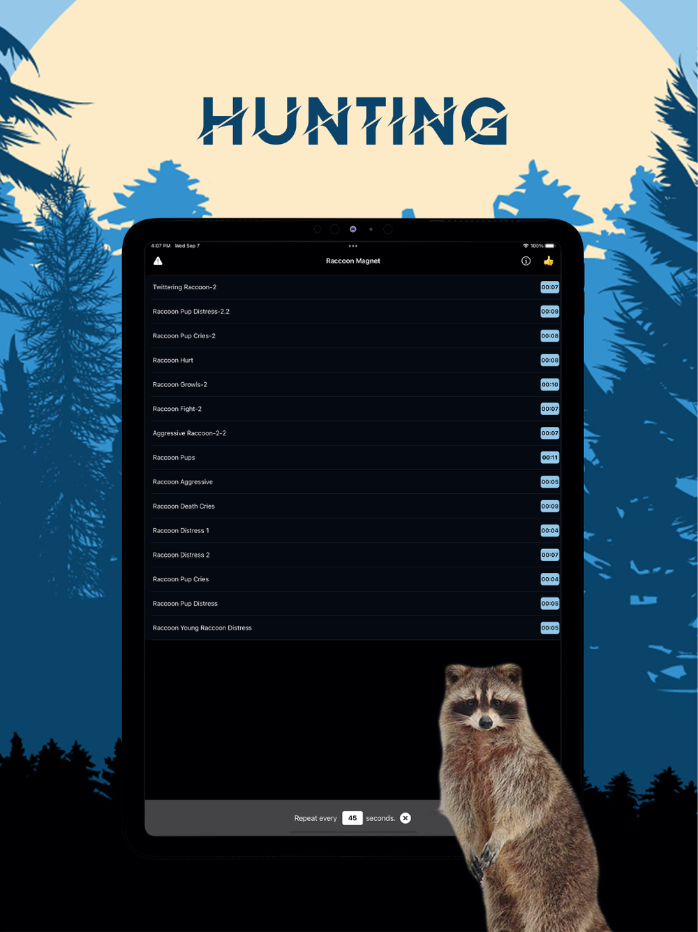 You can play the sounds individually and set them to repeat after the amount of seconds that you desire. Or you can manually tap different raccoon hunting calls to create a deadly combination of calls that will work perfectly for the raccoons you are hunting.