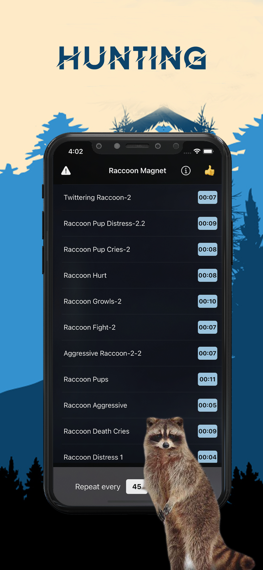 One of the most important tools for a successful hunt are great raccoon sounds. With this app you can be a raccoon hunting pro!