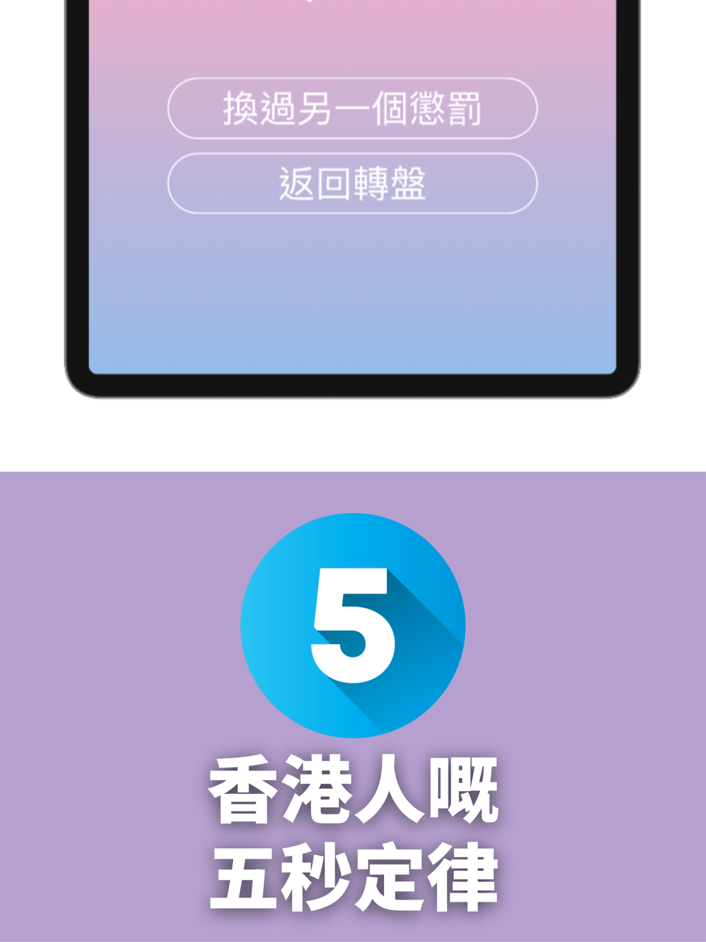 - 五秒內必須答問題,否則要接受懲罰(app內設有預設懲罰,亦可由眾人商議想出)