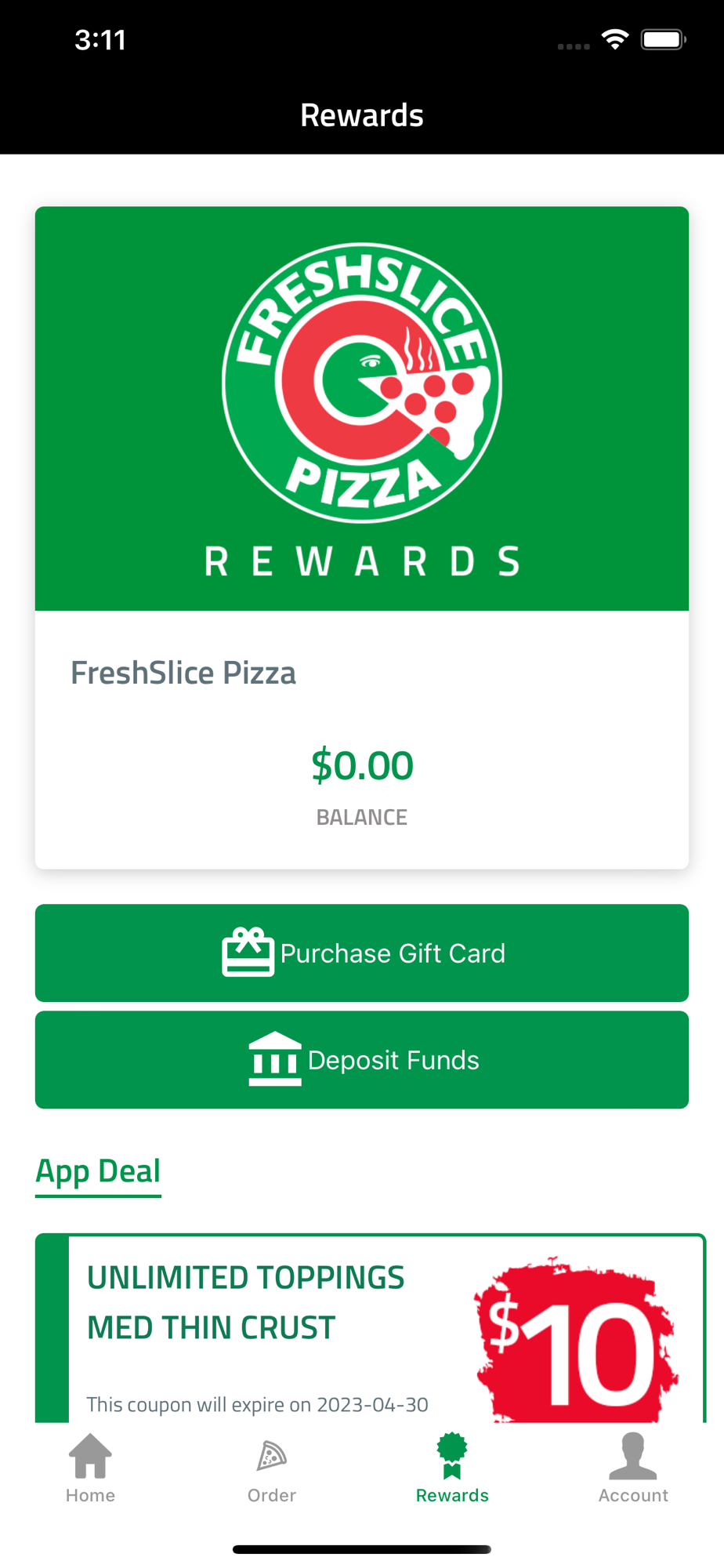Order Freshslice pizza and collect FRESH REWARDS. Get 5% cash back for every purchase into your FRESH REWARDS account and redeem anytime for discounts on future purchases.