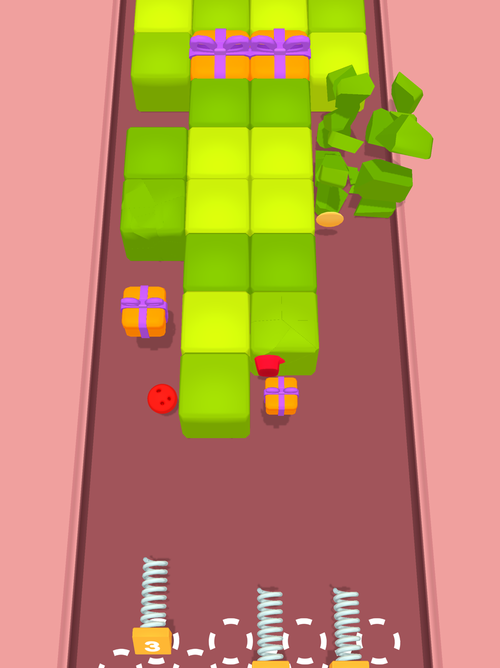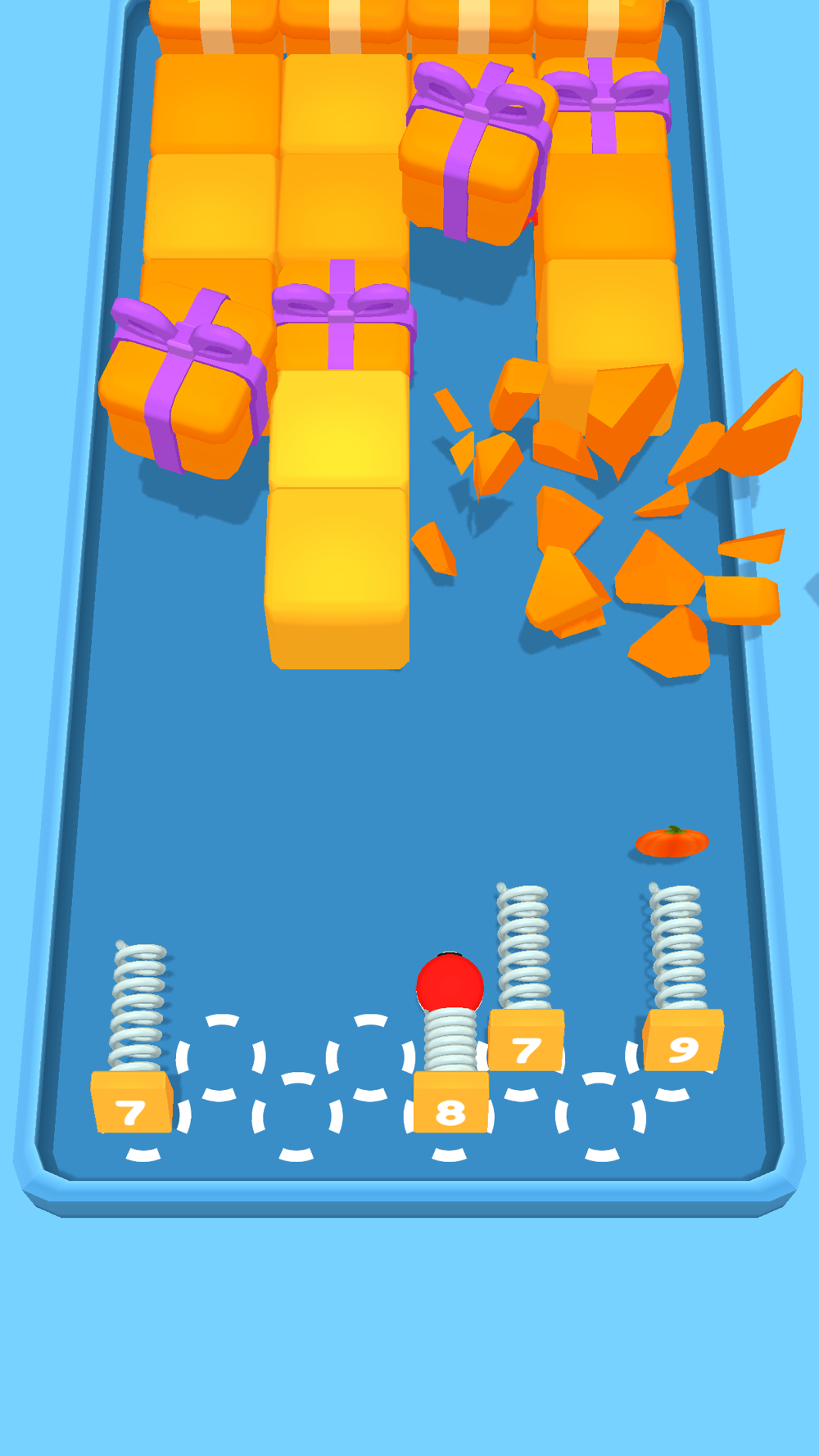 their power. Every hit gives you money. Buy new springs and merge them with the money you earn. Power of the balls and their lifespan depend on their level. Each block has a different health amount. The color of blocks will help you to understand the block level. You have to break all blocks in at least one line to complete level. Don’t forget to collect gift boxes for free springs.