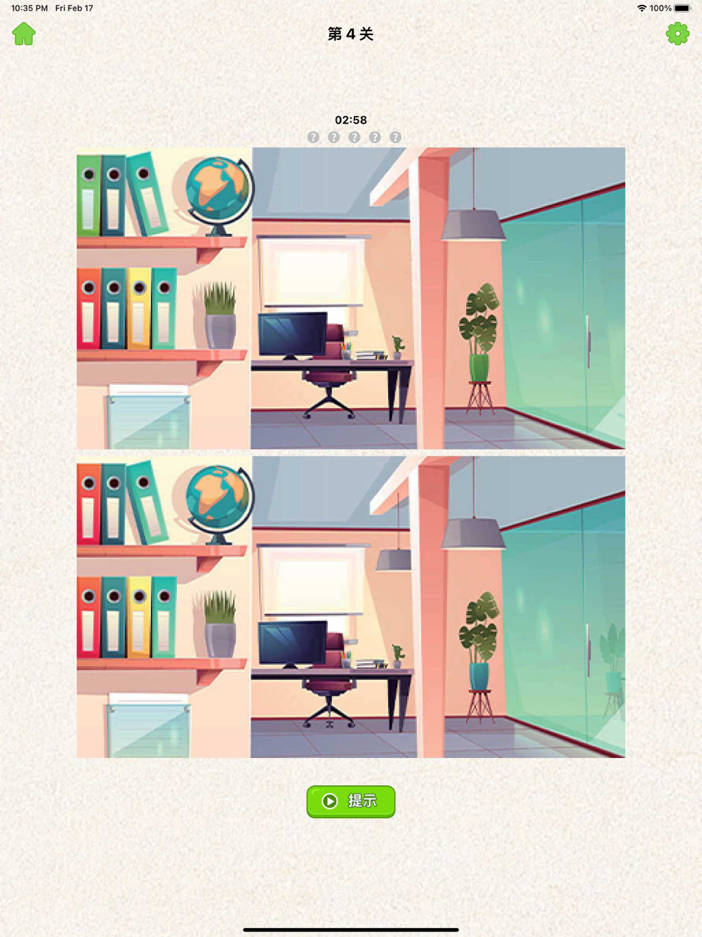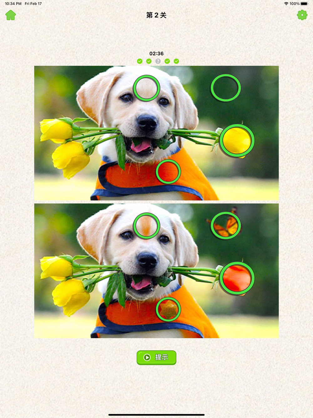 玩法简单:只要点击两幅图片中不相同的地方找出全部不同即可通关。每关设有5处茬点,找出当前图片的所有茬就能顺利进入下一张图片,直到各关所有的图片茬点都按时找到。
