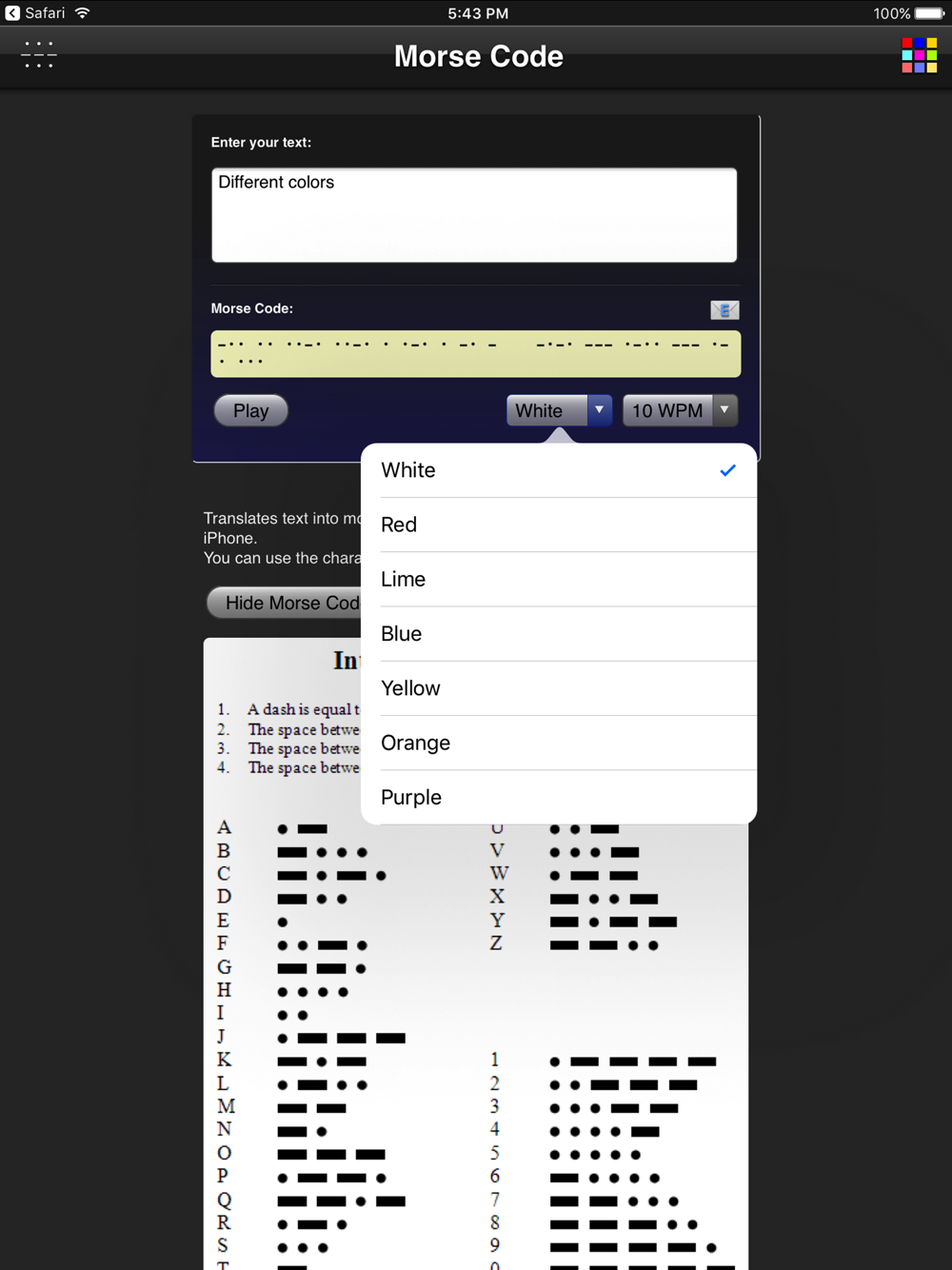 Translates text into morse code and sends the message with a blinking iPhone. The speed (WPM) and the color can be changed.