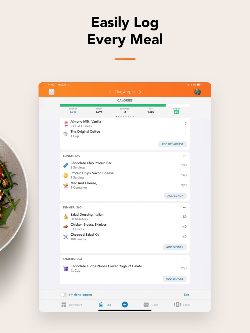• Meal Planning & Targets – meal targets help you calculate suggested calories per meal based on your goal while meal planning allows you to customize your meal names and snacks for more accurate records.