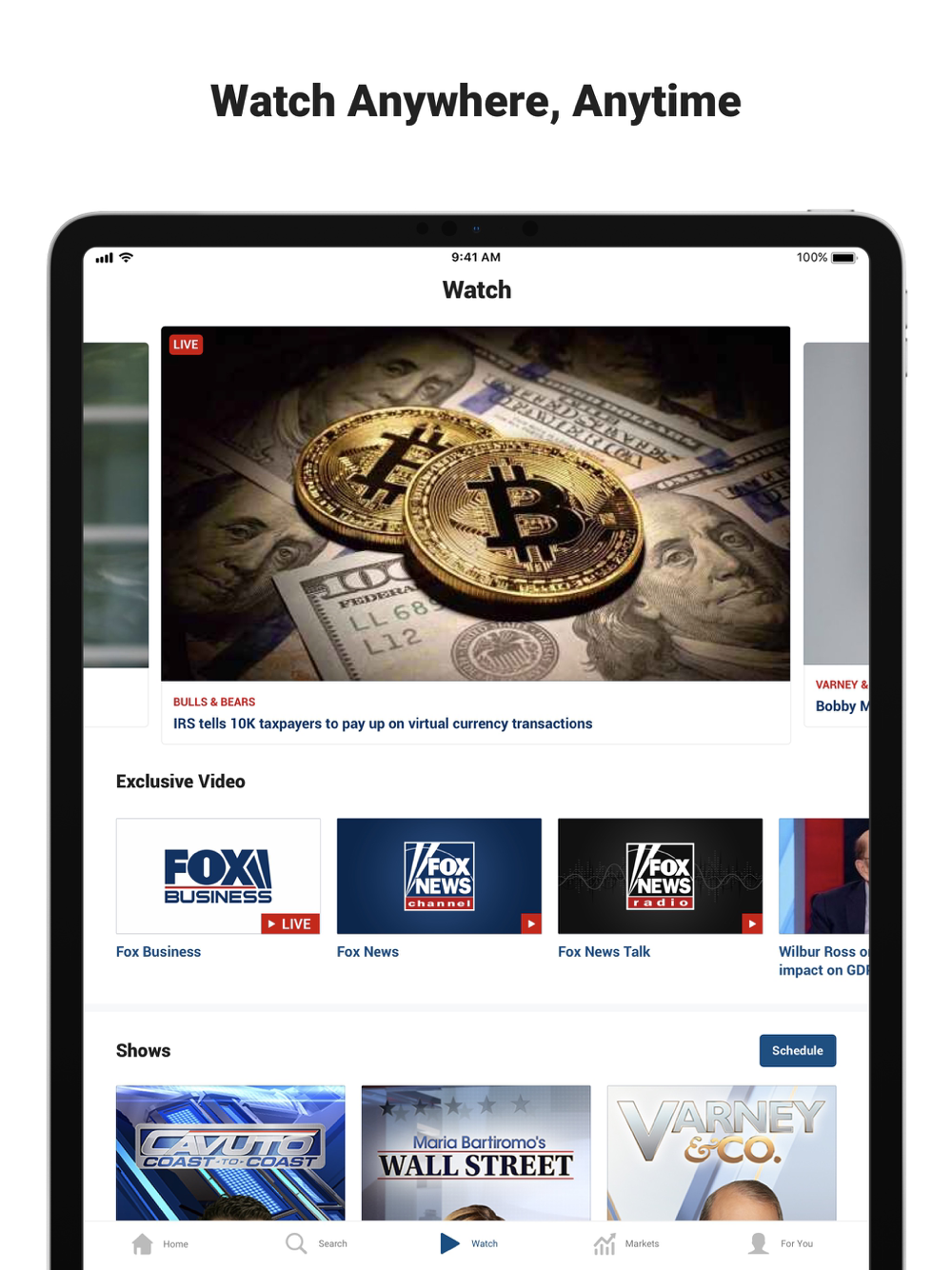 The “Watch” tab is your place to sit back and enjoy live and on-demand video featuring your favorite Fox Business Network personalities. You can watch Fox Business Network live*, catch up on full episodes*, or watch free, curated highlights.