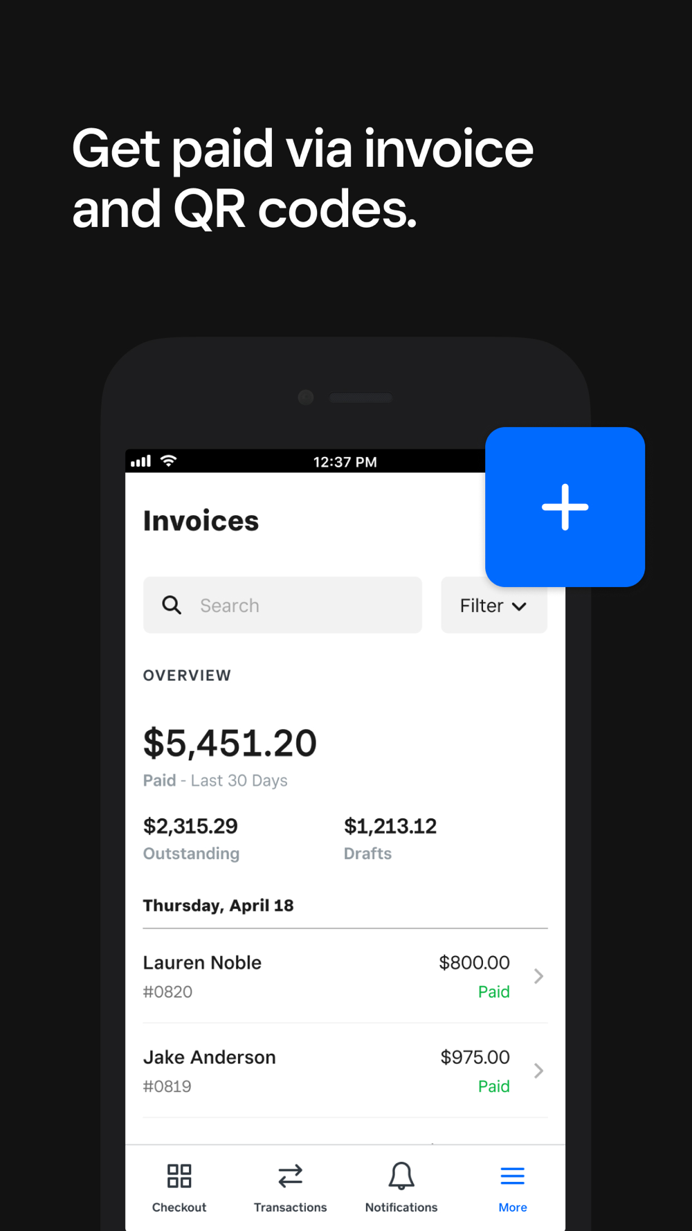Issue and track invoices directly from the app. Customize your invoices, set up weekly or monthly recurring invoices from your Dashboard, and let customers pay online with a credit or debit card.
