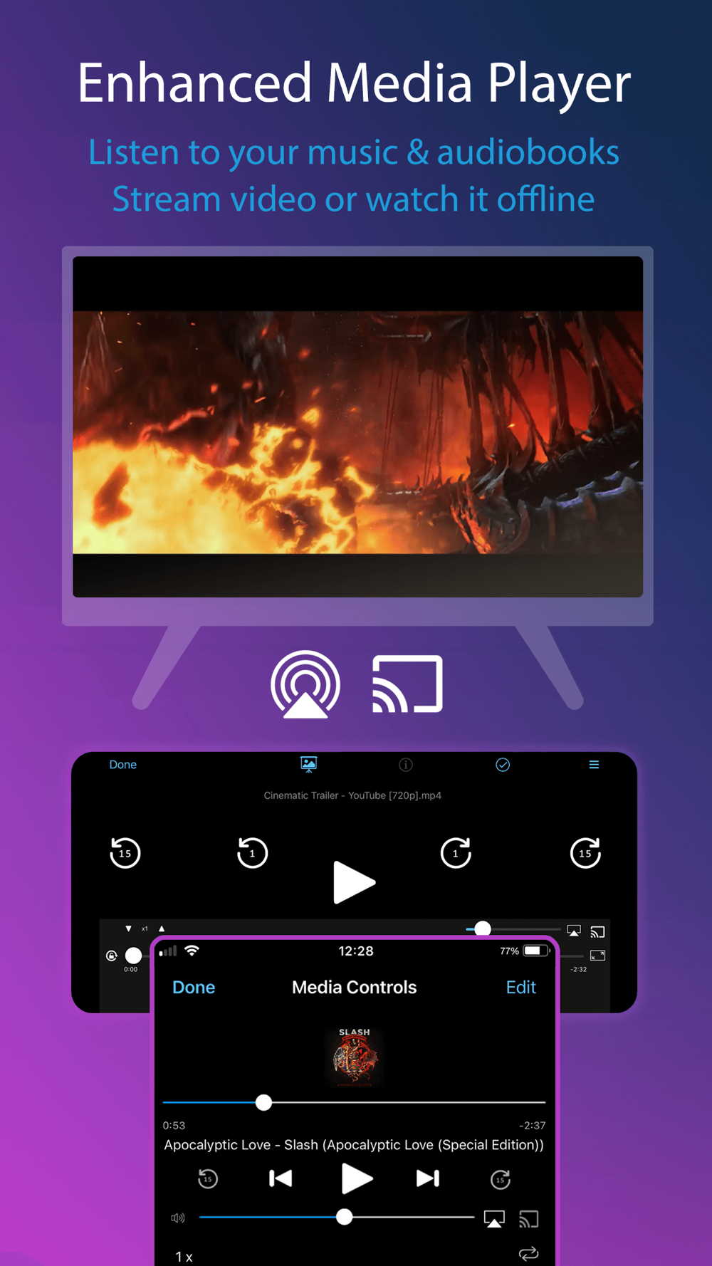 Stream movie files or listen to music, both with AirPlay™ and Chromecast support. Use our built-in viewers or stream video to other apps.