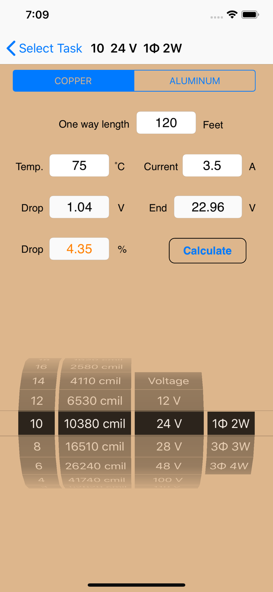 ● Calculate the voltage drop in a line based on length, size, current and temperature.