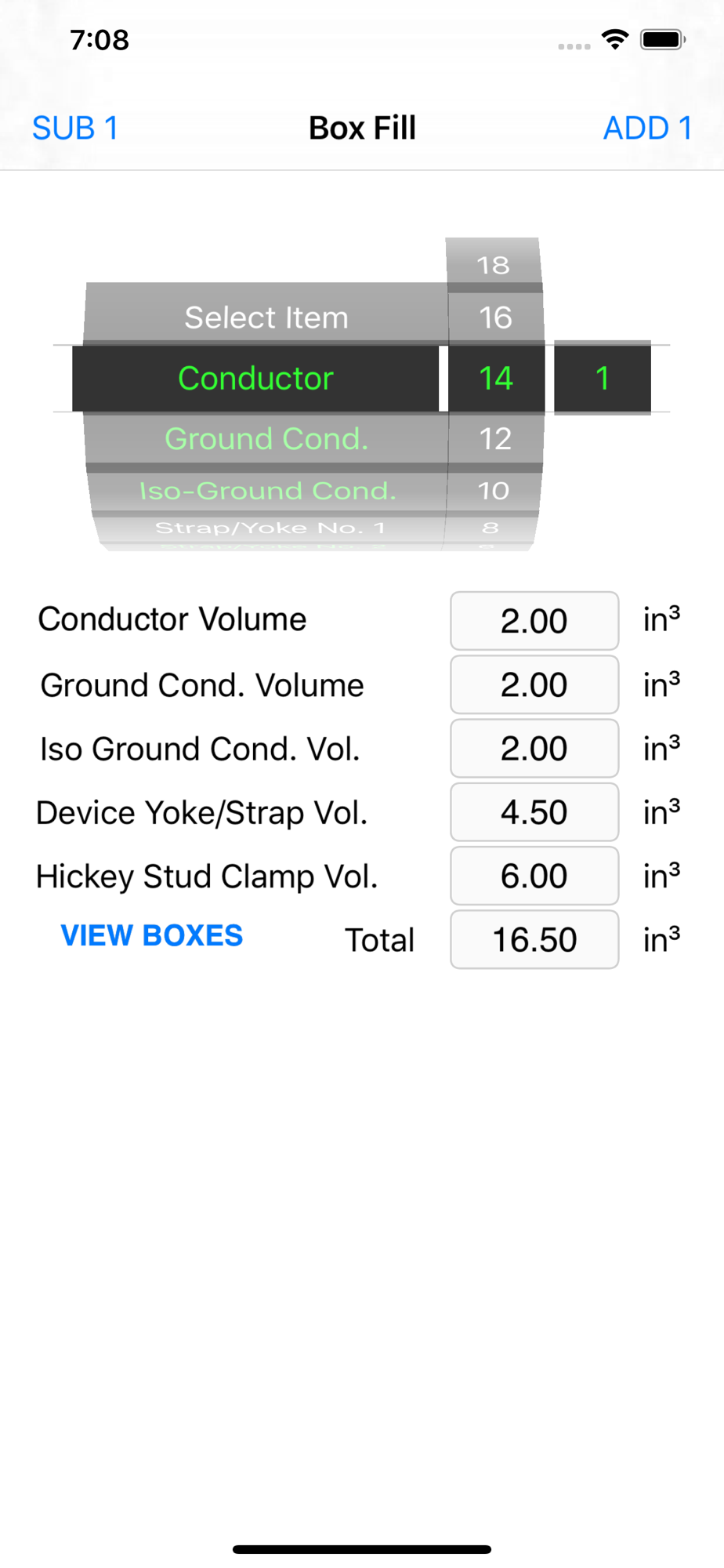 ● Find the total box fill by entering the size and number of conductors, straps and clamps.