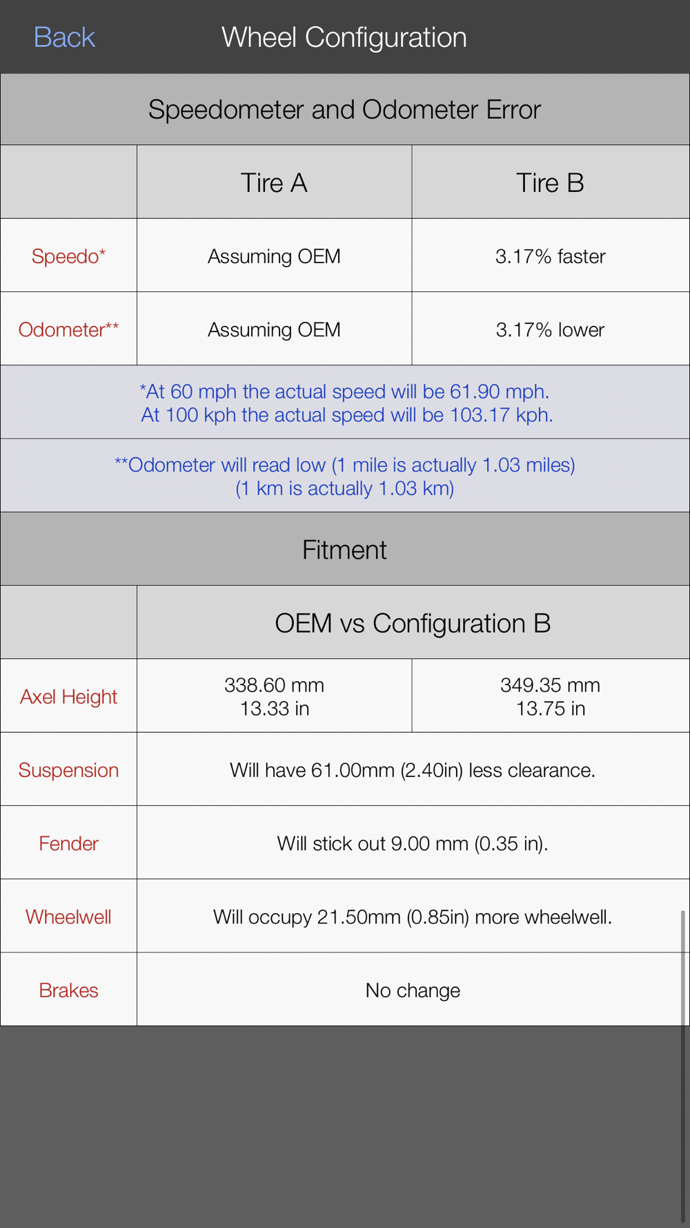 Provides the user the ability to identify vehicle fitment related issues that may potentially result from different tire and wheel configurations.