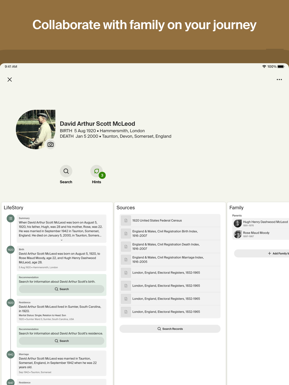 • Add photos, hints, or ancestor stories and watch your personalized family tree grow