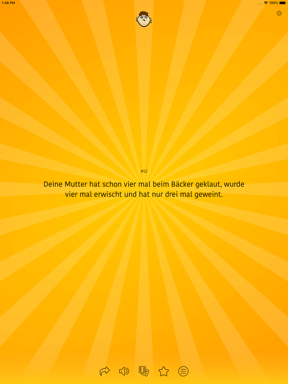 Hol dir das Original mit tausenden "Deine Mutter..."-Sprüchen. Ob flach, lustig oder derbe, ob Klassiker oder neu, hier findest du sie alle!