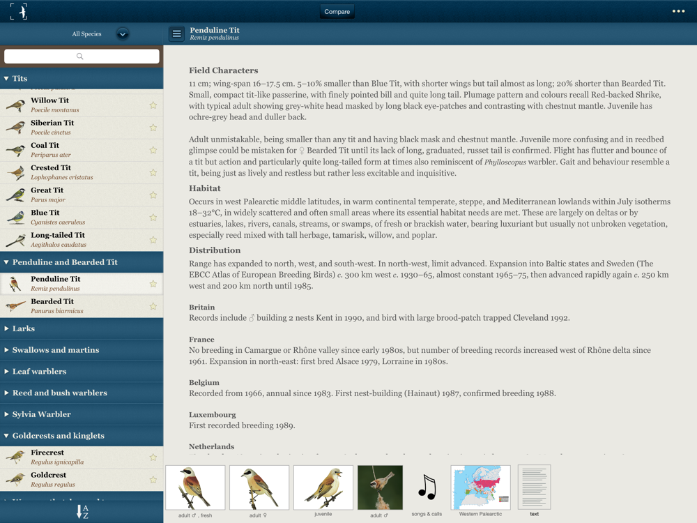 A high-quality digital field guide, with bird names in 15 languages, covering 352 species of birds regularly seen in Northern Europe. This list covers all except rarer vagrants and includes every bird likely to be seen by the vast majority of birdwatchers in the region throughout the year. Countries covered include Britain, Ireland, Iceland, Norway, Sweden, Finland, Denmark, Holland (The Netherlands), Belgium, Germany, Poland, Latvia, Lithuania, Estonia, Luxembourg and Northern France. Comprehensive information is provided including: multiple annotated illustrations by leading artists showing the full range of plumages including rarer races and variations, beautiful still photographs for many species; songs and calls, maps showing distribution in Europe, North Africa and the Middle East and the full detailed text accounts from the Concise edition of Birds of the Western Palearctic (THE standard reference work originally published by Oxford University Press). Perfect for more experienced birders who will appreciate the comprehensive and professional ornithological content in this App.