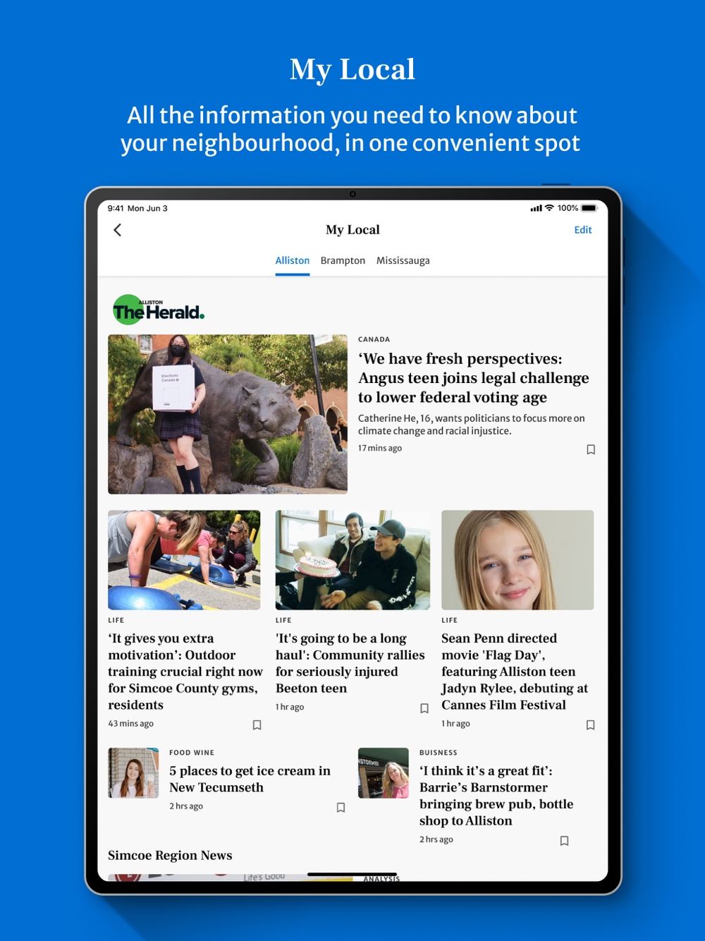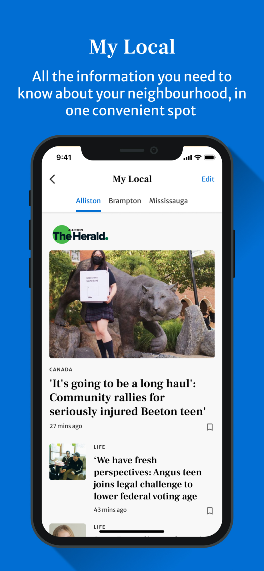- New MyLocal tab – select up to seven communities to receive coverage on local news, issues, and events specific to your chosen communities*