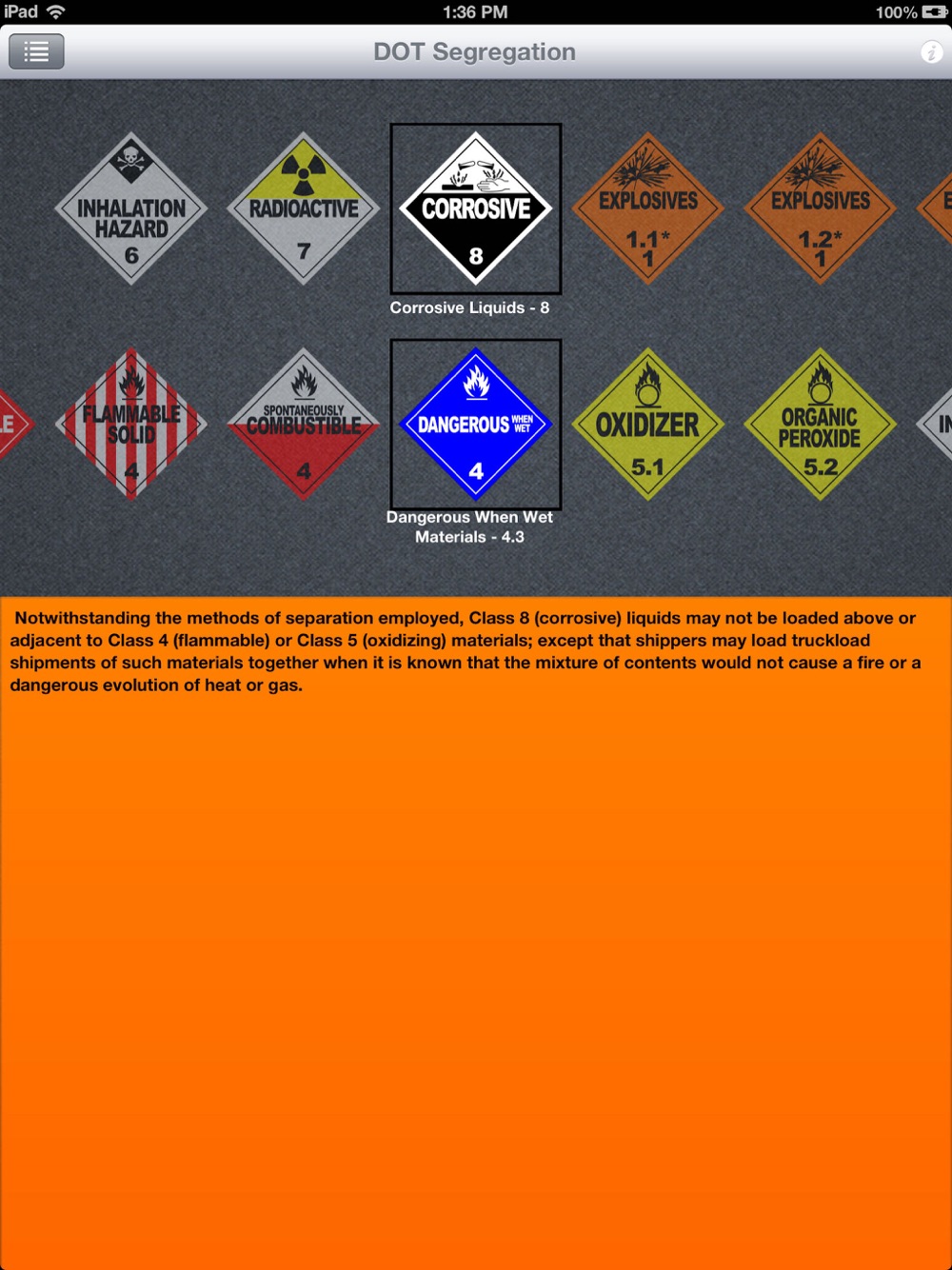 The information presented in this app can help the hazmat employee training requirements by supplementing knowledge with a quick and easy to use interface.