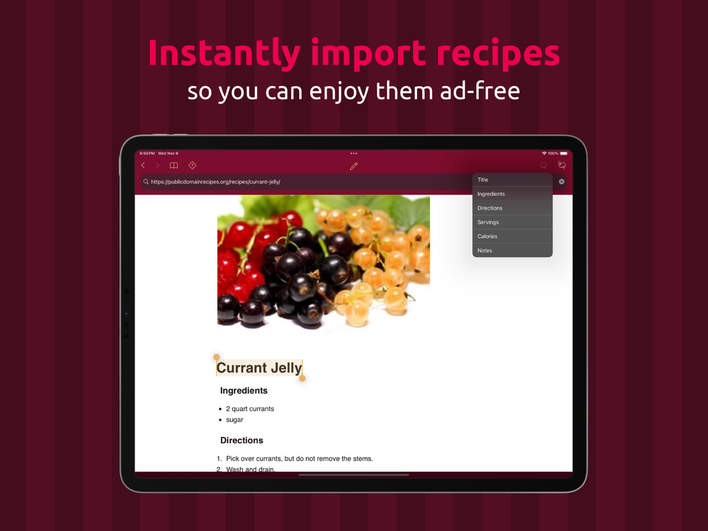 • One-touch Instant Import from more than 100 catalogued recipe sites, plus innumerable uncatalogued sites