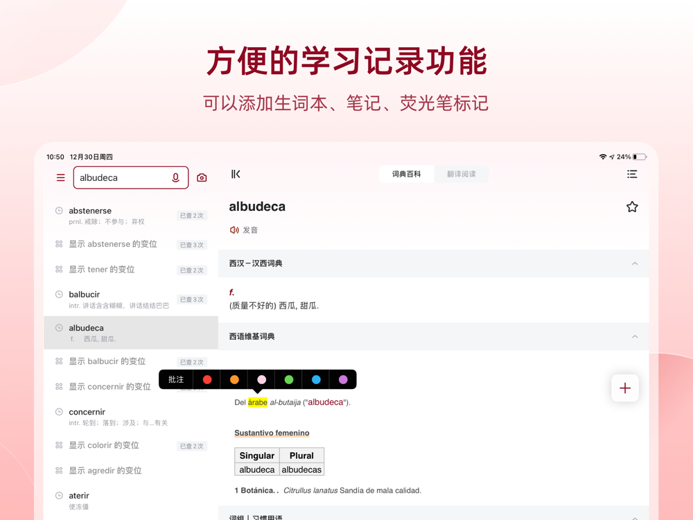 - 生词本、笔记、荧光笔标记、历史记录功能, 支持学习记录云端同步;