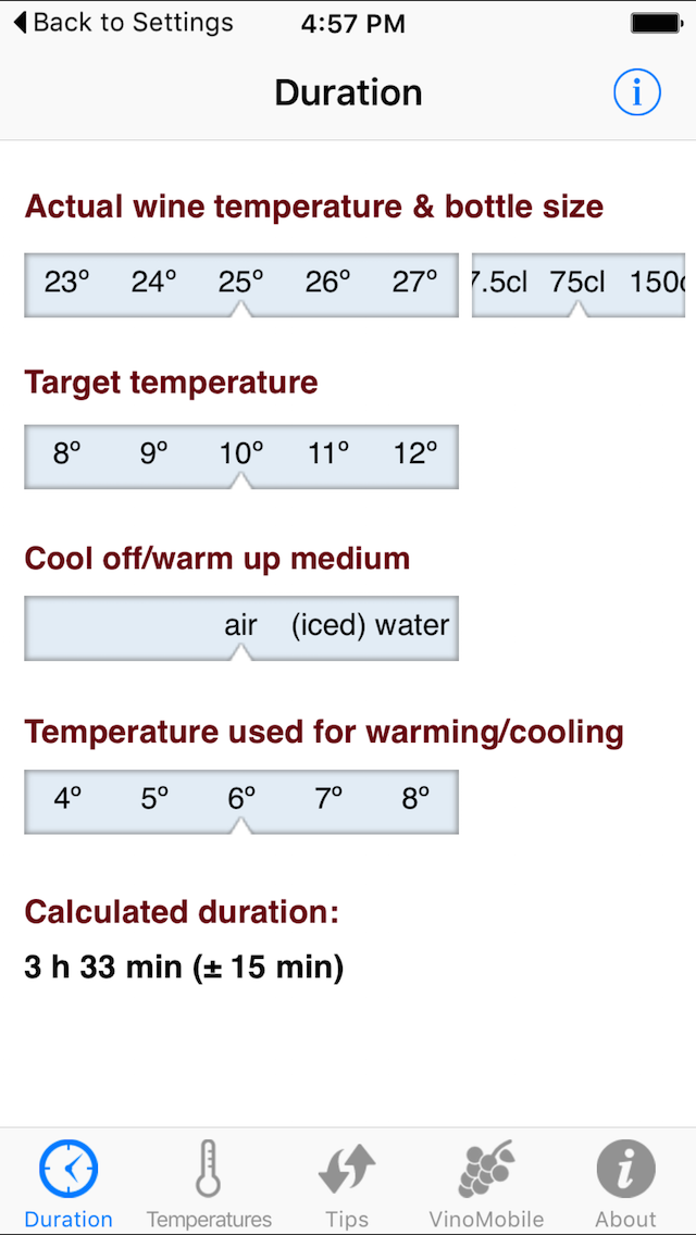 Another App about wine from the VinoMobile® series: WINE TEMPERATURES. With this App it is very easy to calculate how long a bottle of wine must be cooled or warmed until it has reached the right drinking temperature.
