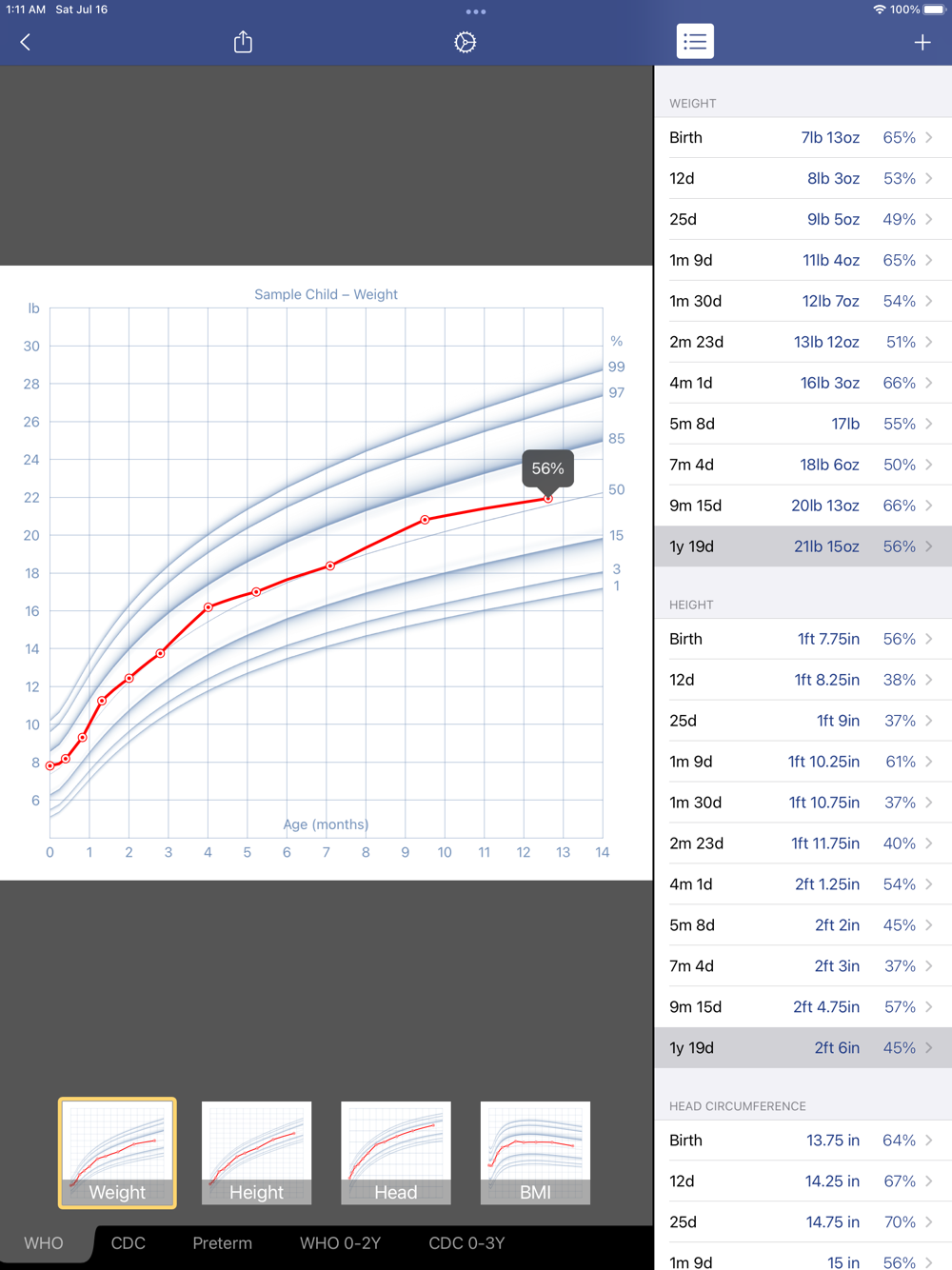 • Exact percentiles of your child's measurements